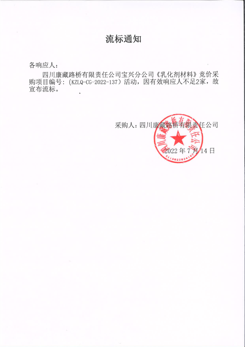 四川康藏路橋有限責(zé)任公司寶興分公司乳化劑材料采購流標(biāo)通知