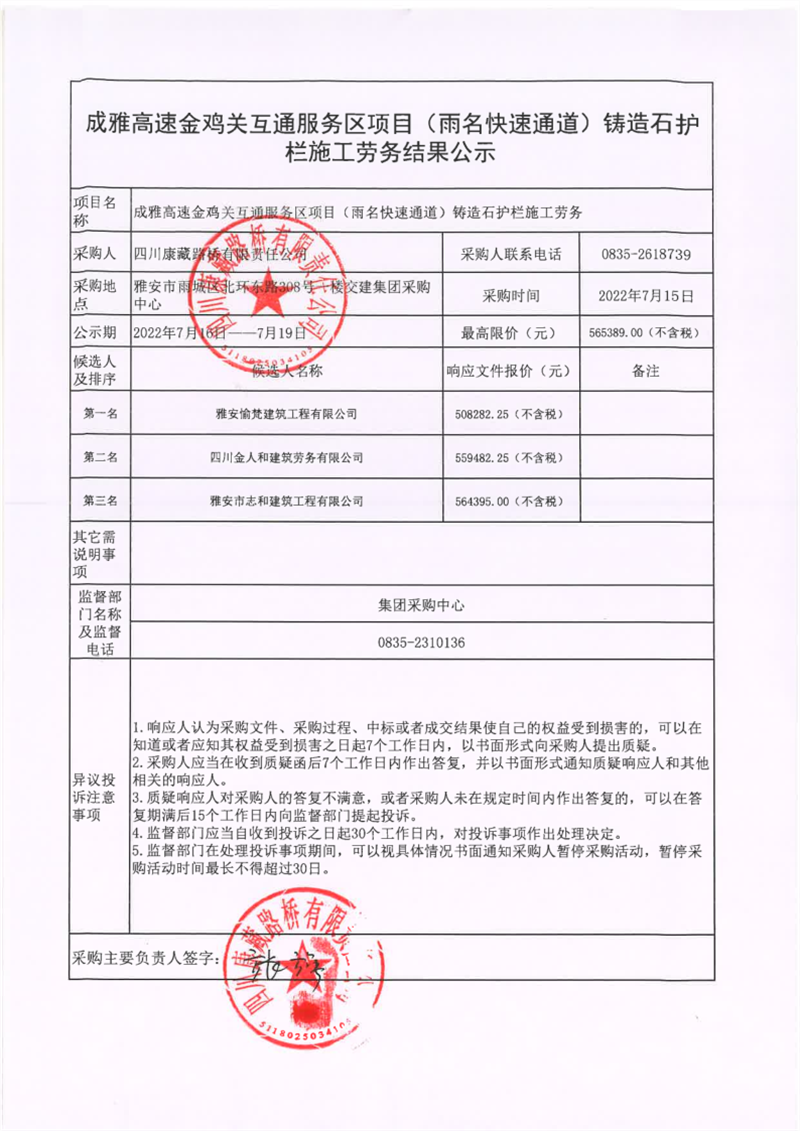 四川康藏路橋有限責(zé)任公司成雅高速金雞關(guān)互通服務(wù)區(qū)項目(雨名快速通道)鑄造石護(hù)欄工程施工勞務(wù)結(jié)果公示
