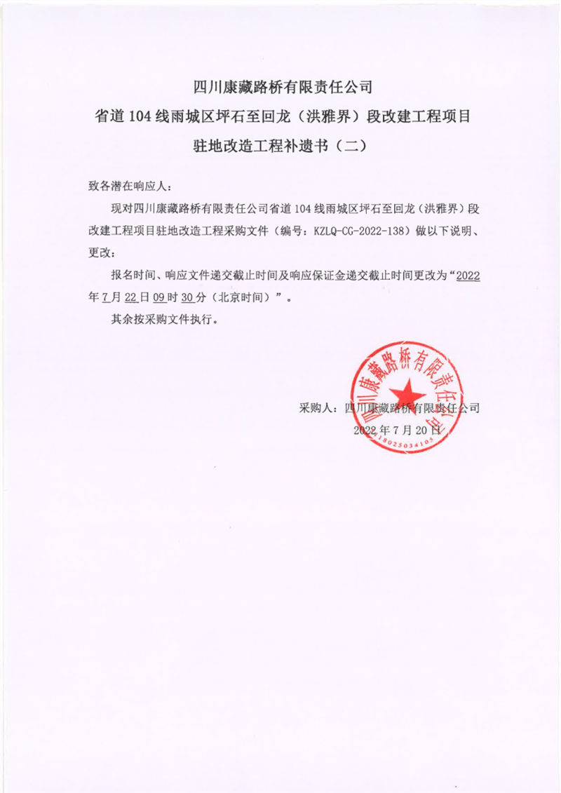 四川康藏路橋有限責(zé)任公司省道104線雨城區(qū)坪石至回龍(洪雅界)段改建工程項目駐地改造工程補(bǔ)遺書(二)
