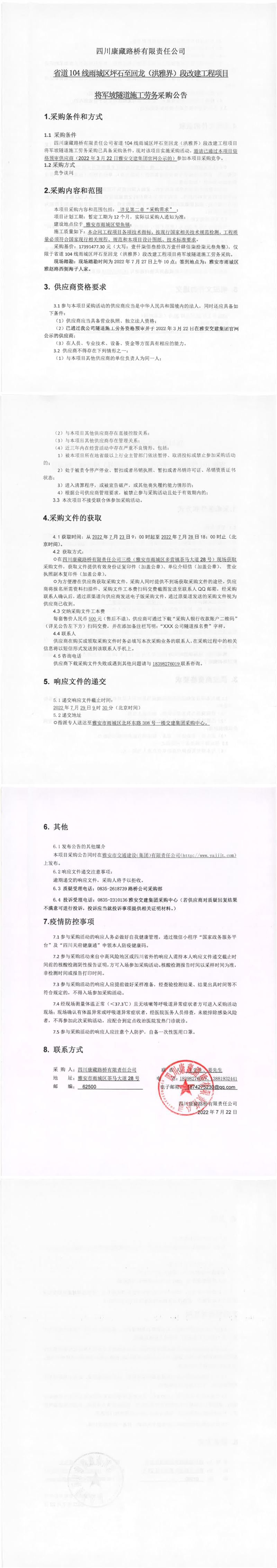 四川康藏路橋有限責(zé)任公司省道104線(xiàn)雨城區(qū)坪石至回龍(洪雅界)段改建工程項(xiàng)目將軍坡隧道施工勞務(wù)采購(gòu)公告