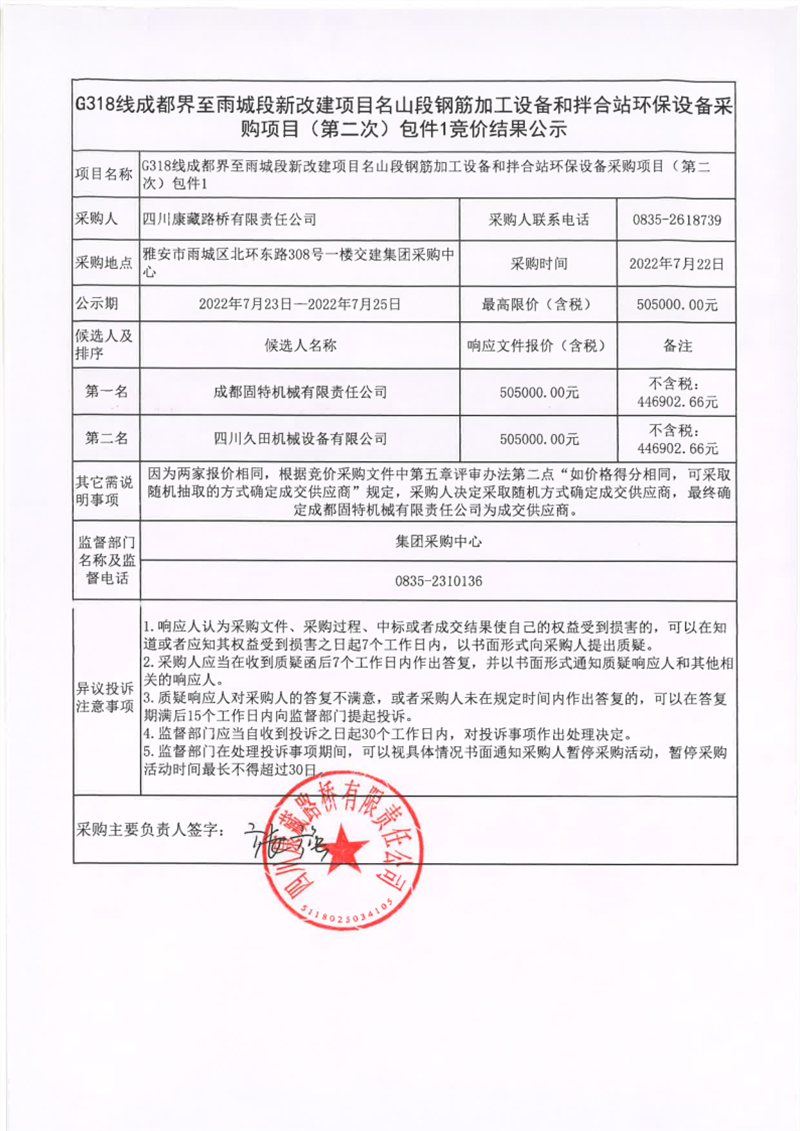 四川康藏路橋有限責(zé)任公司G318線(xiàn)成都界至雨城段新改建項(xiàng)目名山段鋼筋加工設(shè)備和拌合站環(huán)保設(shè)備采購(gòu)項(xiàng)目(第二次)包件1競(jìng)價(jià)結(jié)果公示