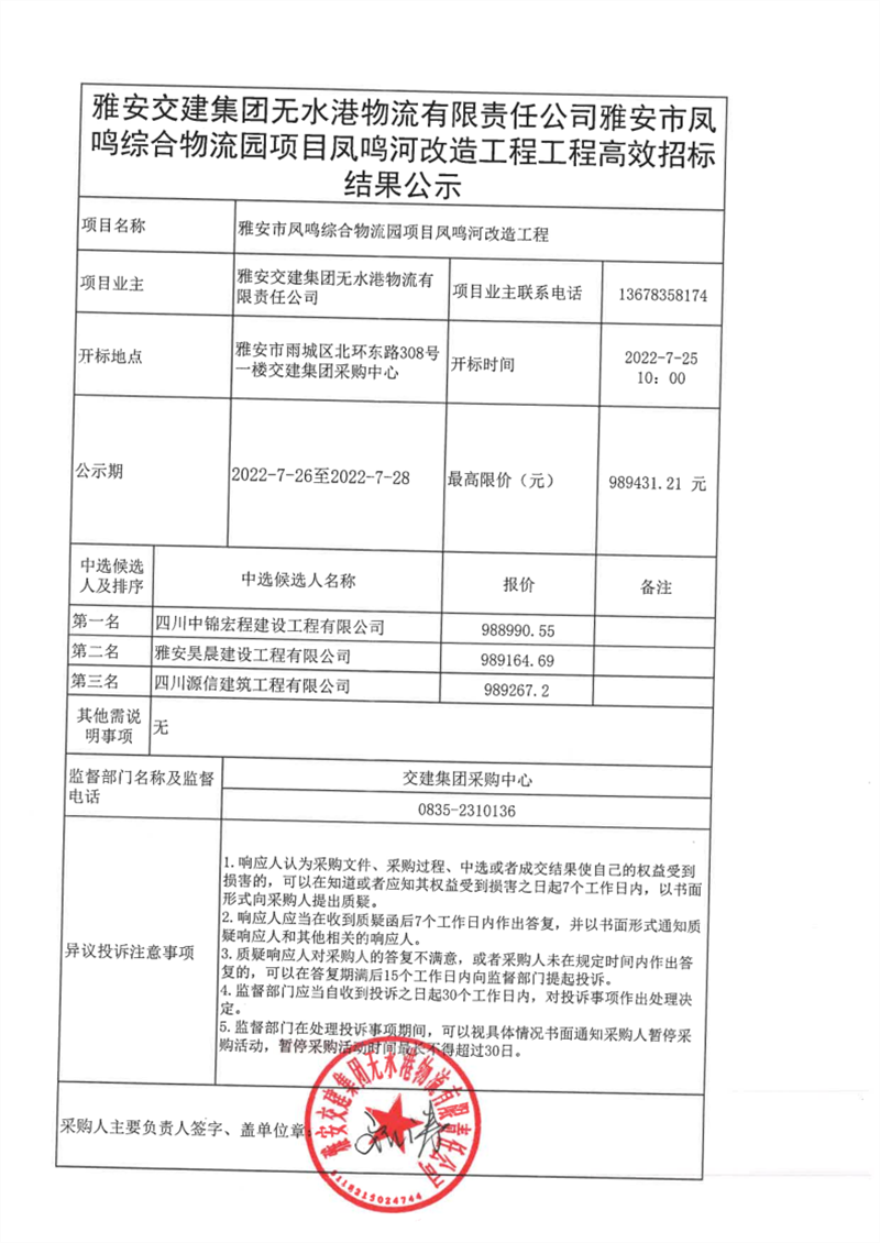 雅安交建集團無水港物流有限責(zé)任公司雅安市鳳鳴綜合物流園鳳鳴河改造工程工程高效招標(biāo)結(jié)果公示