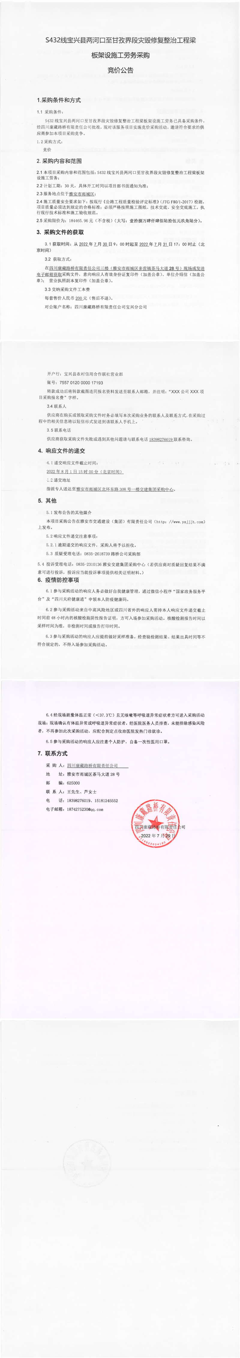 四川康藏路橋有限責(zé)任公司S432線寶興縣兩河口至甘孜界段災(zāi)毀修復(fù)整治工程梁板架設(shè)施工勞務(wù)采購競價公告