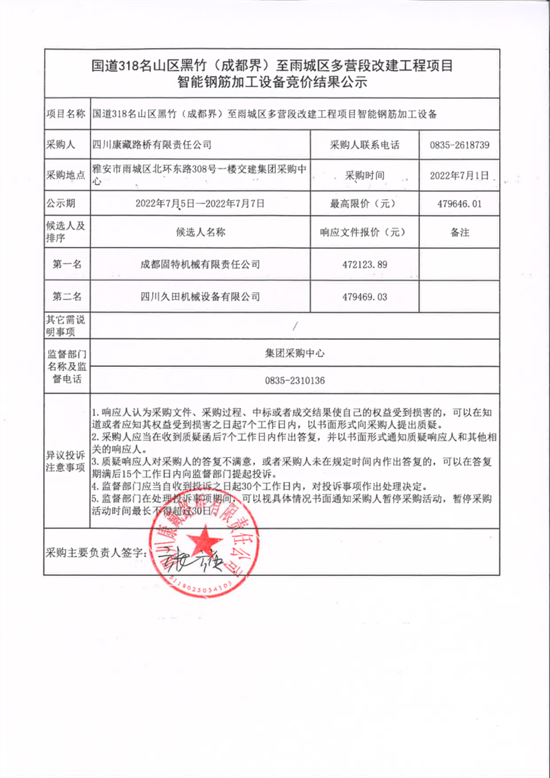四川康藏路橋有限責(zé)任公司國道318名山區(qū)黑竹(成都界)至雨城區(qū)多營段改建工程智能鋼筋加工設(shè)備競價結(jié)果公示