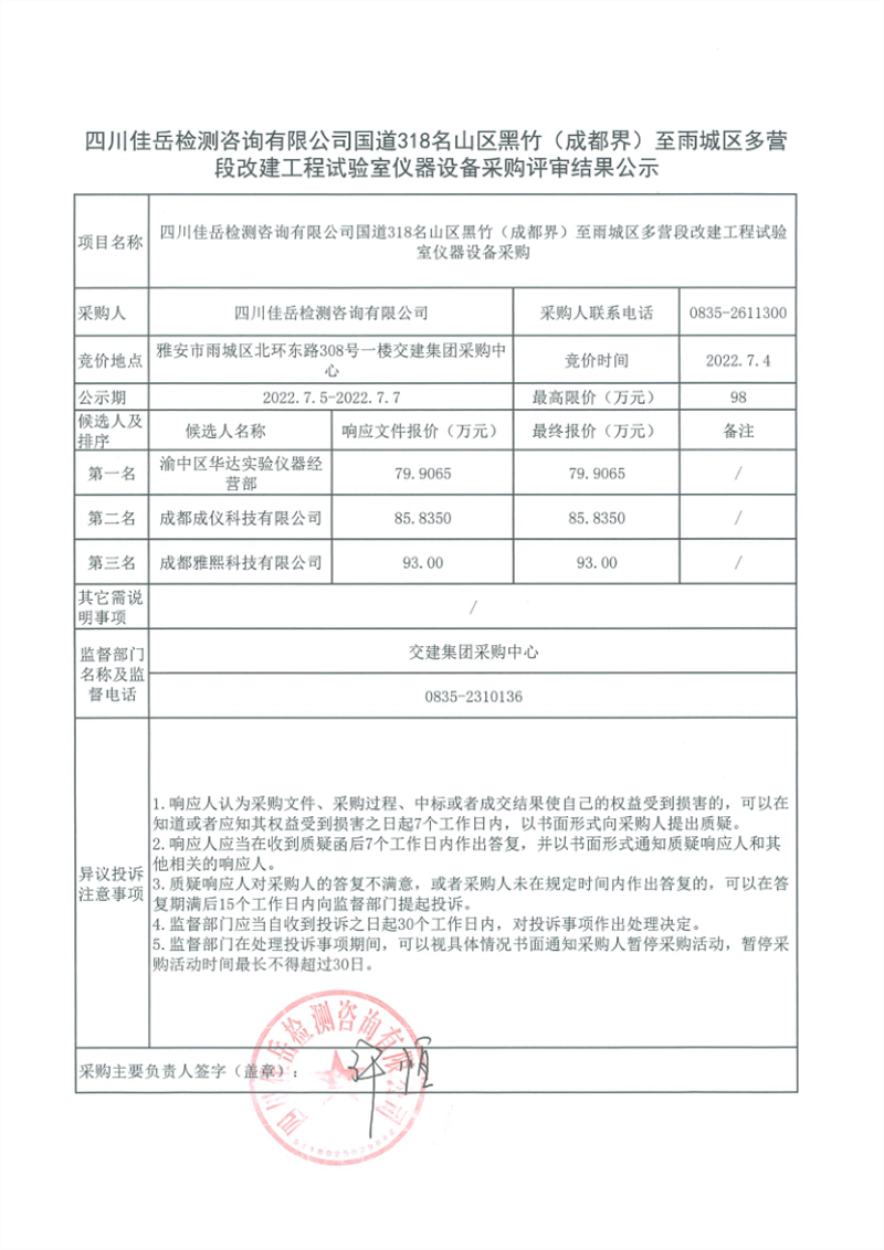 四川佳岳檢測咨詢有限公司國道318名山區(qū)黑竹(成都界)至雨城區(qū)多營段改建工程試驗(yàn)室儀器設(shè)備采購評(píng)審結(jié)果公示