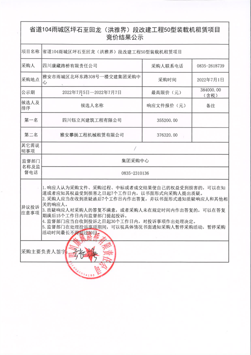 四川康藏路橋有限責任公司省道104雨城區(qū)坪石至回龍(洪雅界)段改建工程50型裝載機租賃項目競價結(jié)果公示