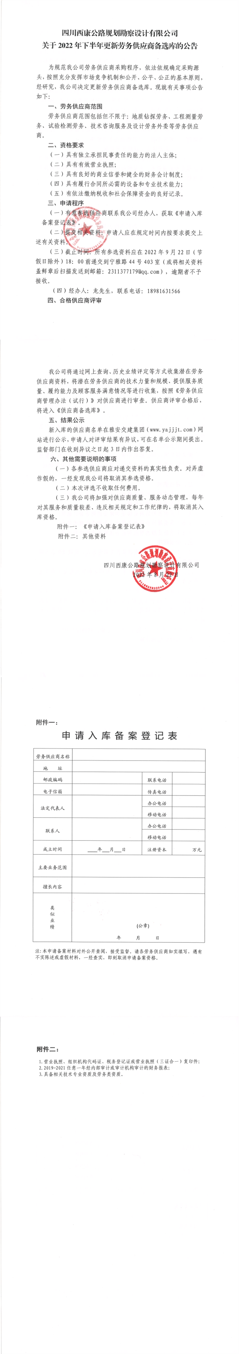 四川西康公路規(guī)劃勘察設(shè)計有限公司關(guān)于2022年下半年更新勞務(wù)供應(yīng)商備選庫的公告