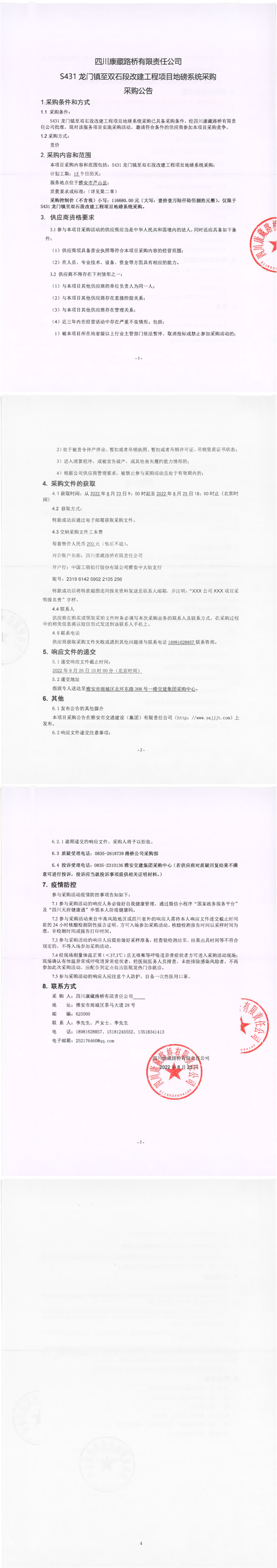 四川康藏路橋有限責(zé)任公司S431龍門鎮(zhèn)至雙石段改建工程項(xiàng)目地磅系統(tǒng)采購(gòu)采購(gòu)公告