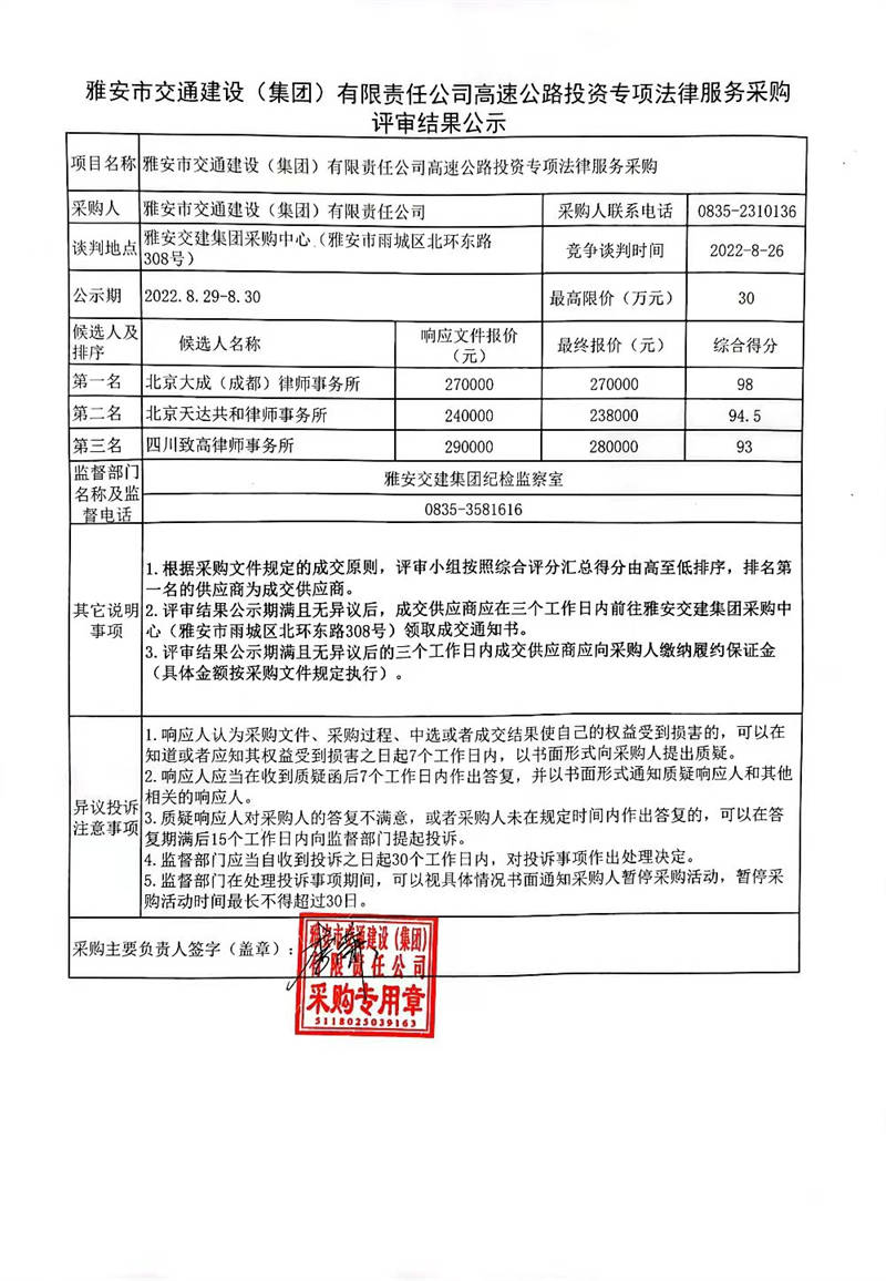 雅安市交通建設(shè)(集團(tuán))有限責(zé)任公司高速公路投資專項(xiàng)法律服務(wù)采購評審結(jié)果公示