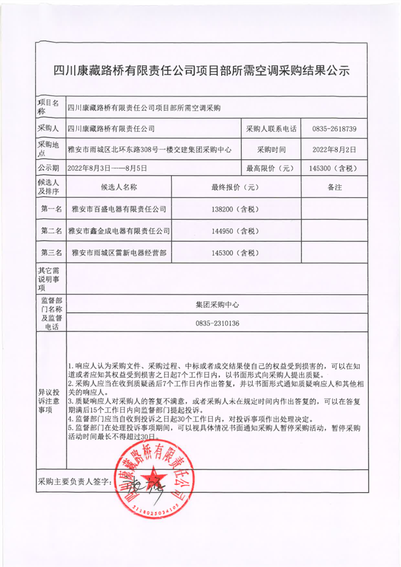 四川康藏路橋有限責(zé)任公司項(xiàng)目部所需空調(diào)采購(gòu)結(jié)果公示