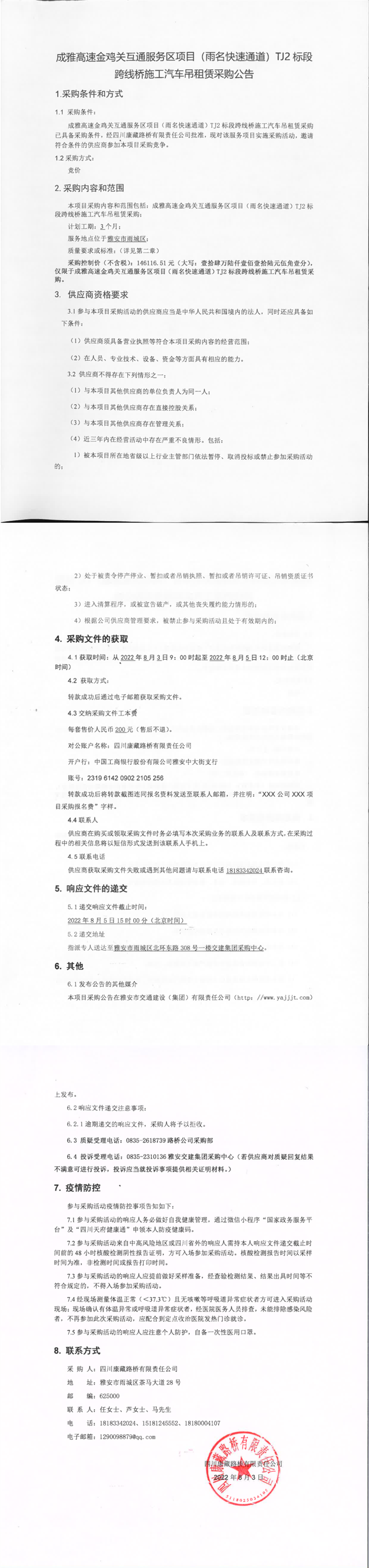四川康藏路橋有限責任公司成雅高速金雞關互通服務區(qū)項目(雨名快速通道)TJ2標段跨線橋施工汽車吊租賃采購公告