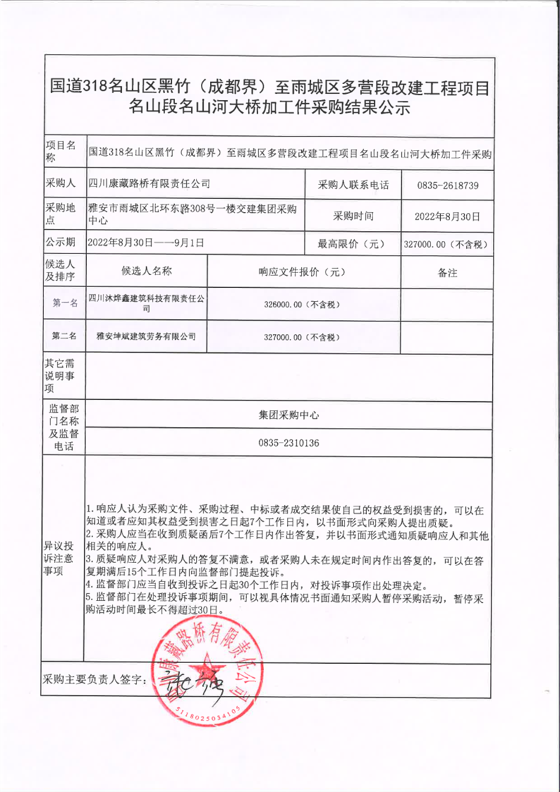 四川康藏路橋有限責(zé)任公司國道318名山區(qū)黑竹(成都界)至雨城區(qū)多營段改建工程項目名山段名山河大橋加工件采購結(jié)果公示