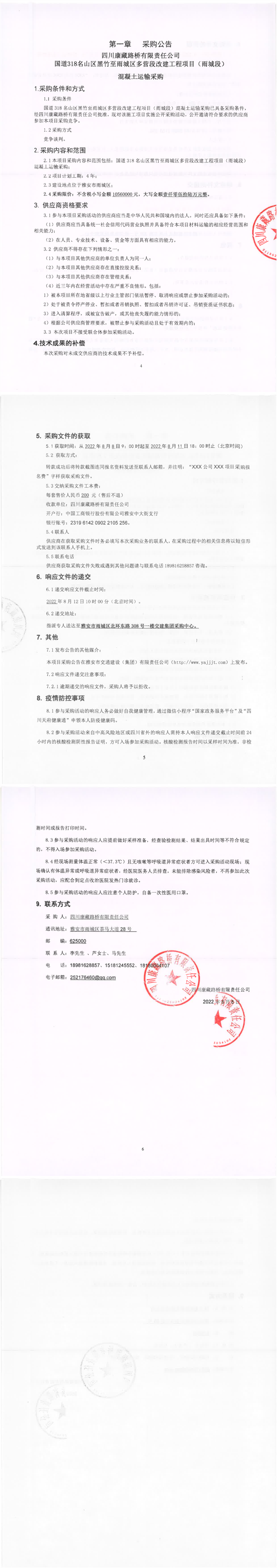 四川康藏路橋有限責(zé)任公司國道318名山區(qū)黑竹至雨城區(qū)多營段改建工程項(xiàng)目(雨城段)混凝土運(yùn)輸采購公告