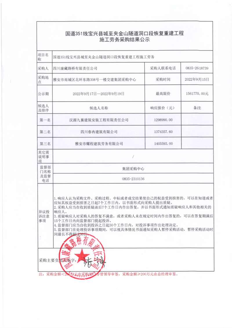四川康藏路橋有限責任公司國道351線寶興縣城至夾金山隧道洞口段恢復重建工程施工勞務采購結果公示