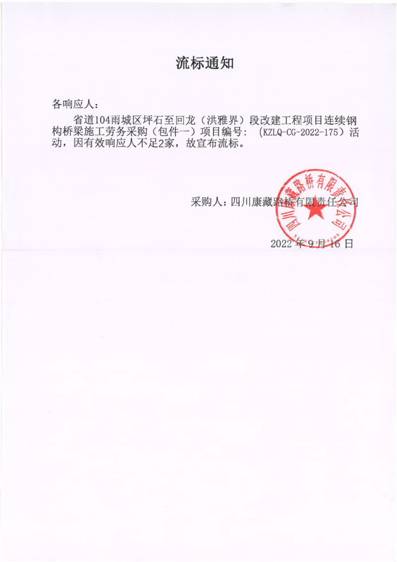 四川康藏路橋有限責任公司省道104雨城區(qū)坪石至回龍(洪雅界)段改建工程項目連續(xù)鋼構(gòu)橋梁施工勞務(wù)采購(包件一)流標通知