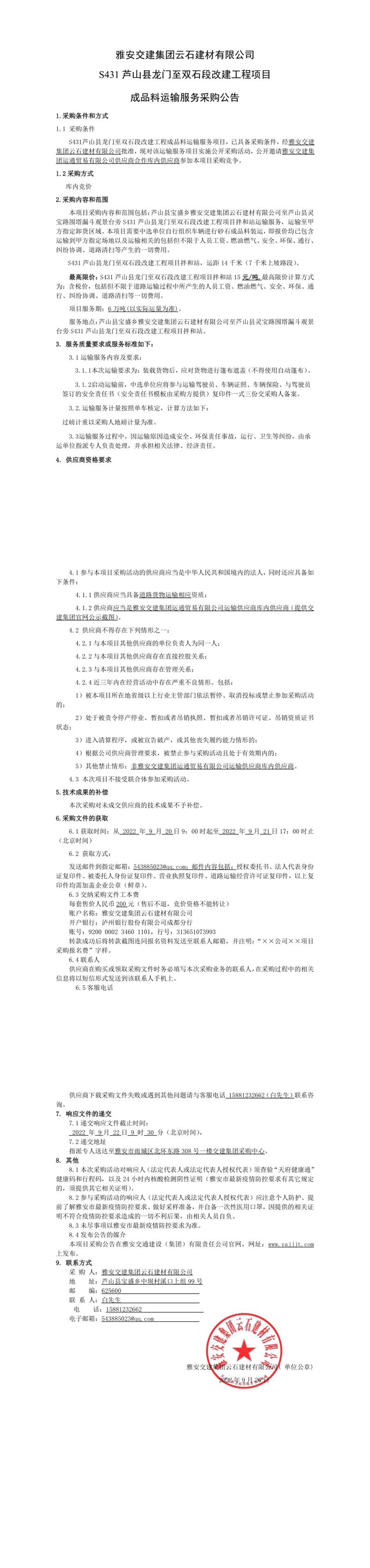 雅安交建集團云石建材有限公司S431蘆山縣龍門至雙石段改建工程項目成品料運輸服務(wù)采購公告