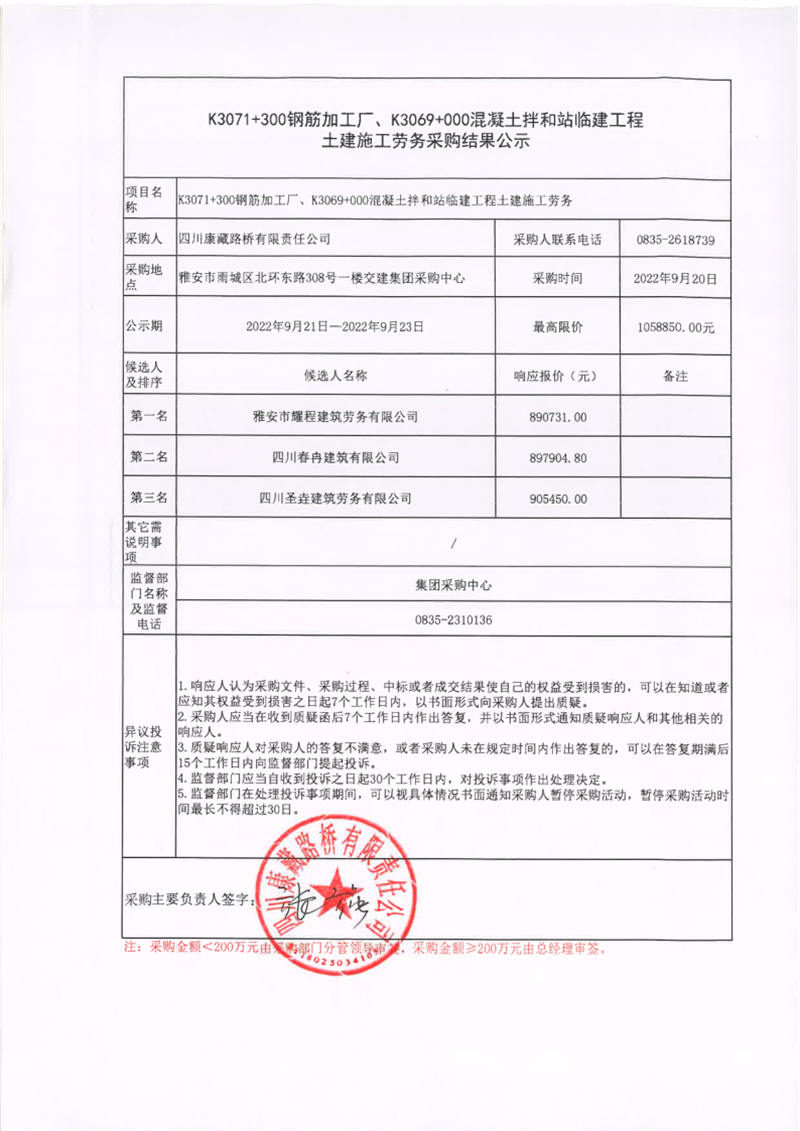 四川康藏路橋有限責(zé)任公司K3071+300鋼筋加工廠、K309+000混凝土拌和站臨建工程土建施工勞務(wù)采購(gòu)結(jié)果公示