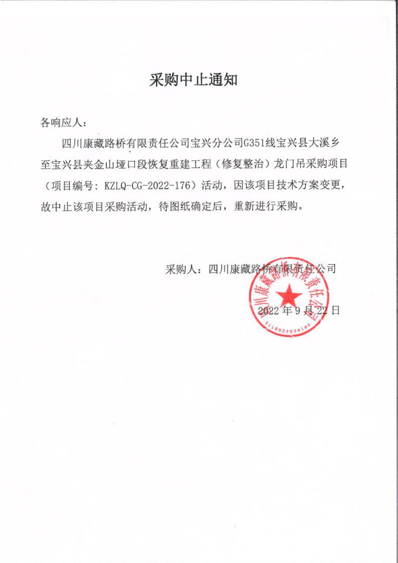 四川康藏路橋有限責(zé)任公司寶興分公司G351線寶興縣大溪鄉(xiāng)至寶興縣夾金山埡口段恢復(fù)重建工程(修復(fù)整治)龍門吊采購中止通知