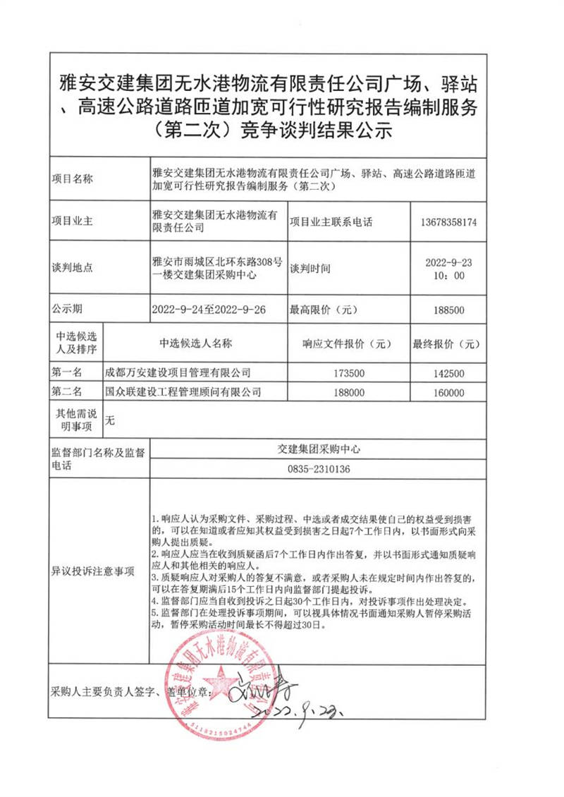 雅安交建集團(tuán)無(wú)水港物流有限責(zé)任公司廣場(chǎng)、驛站、高速公路道路匝道加寬可行性研究報(bào)告編制服務(wù)(第二次)競(jìng)爭(zhēng)談判結(jié)果公示