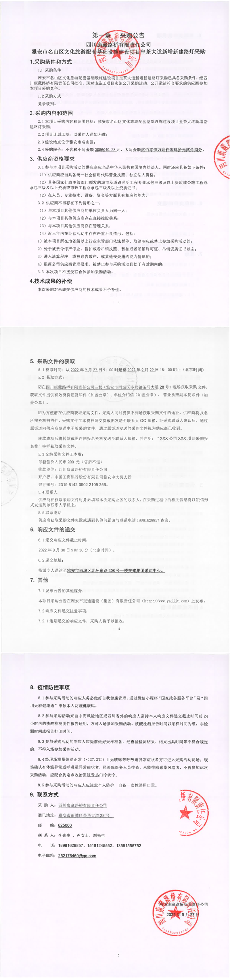 四川康藏路橋有限責(zé)任公司雅安市名山區(qū)文化旅游配套基礎(chǔ)設(shè)施建設(shè)項(xiàng)目皇茶大道新增新建路燈采購(gòu)公告