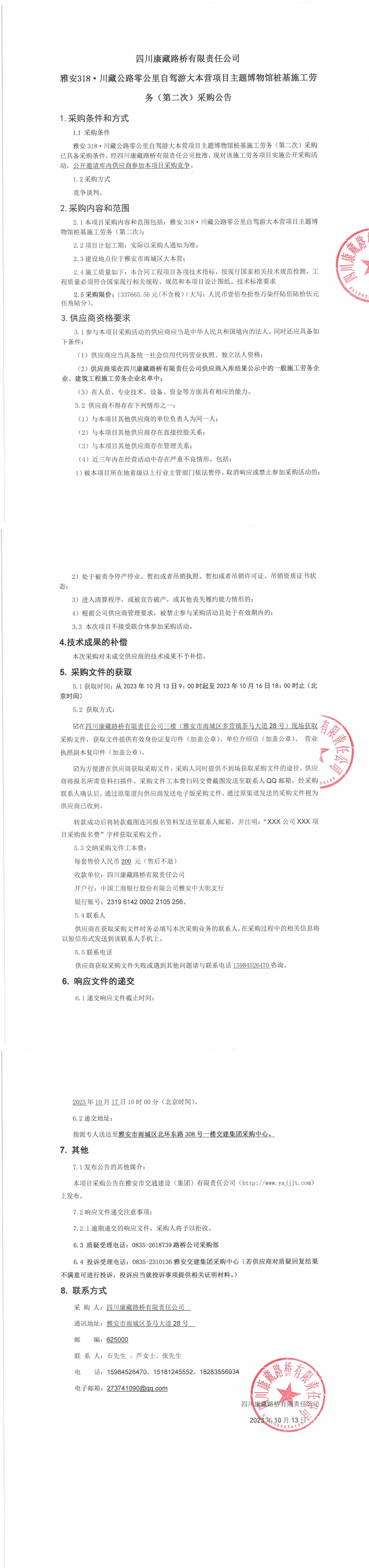 四川康藏路橋有限責任公司雅安318·川藏公路零公里自駕游大本營項目主題博物館樁基施工勞務(第二次)采購公告