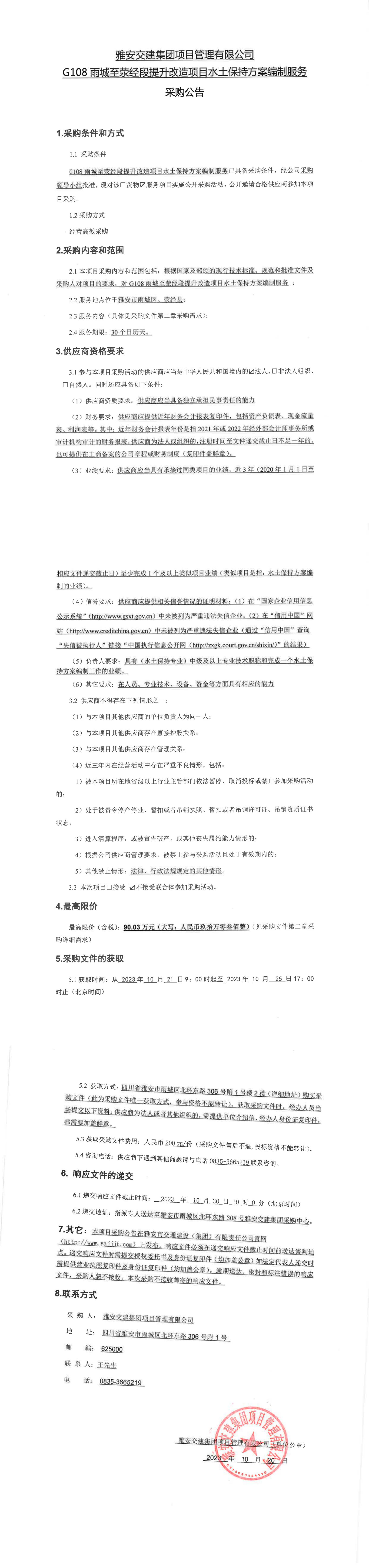 雅安交建集團項目管理有限公司G108雨城至滎經(jīng)段提升改造項目水土保持方案編制服務采購公告
