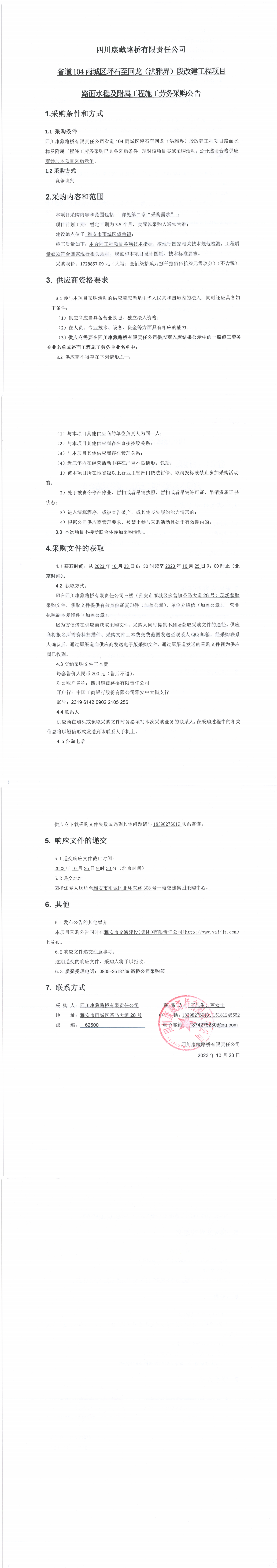 四川康藏路橋有限責(zé)任公司省道104雨城區(qū)坪石至回龍(洪雅界)段改建工程項目路面水穩(wěn)及附屬工程施工勞務(wù)采購公告