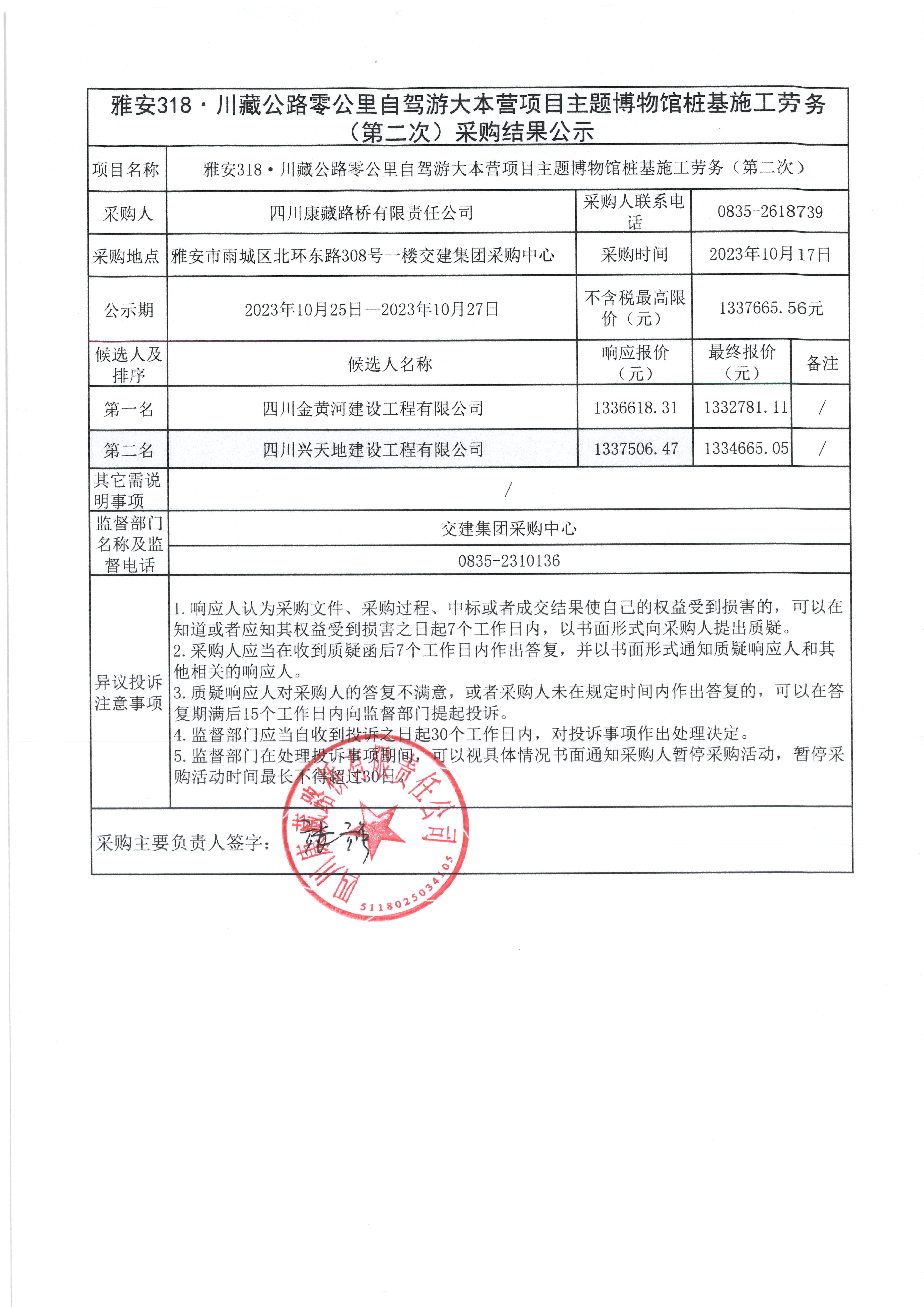 四川康藏路橋有限責任公司雅安318·川藏公路零公里自駕游大本營項目主題博物館樁基施工勞務(第二次)采購結果公示