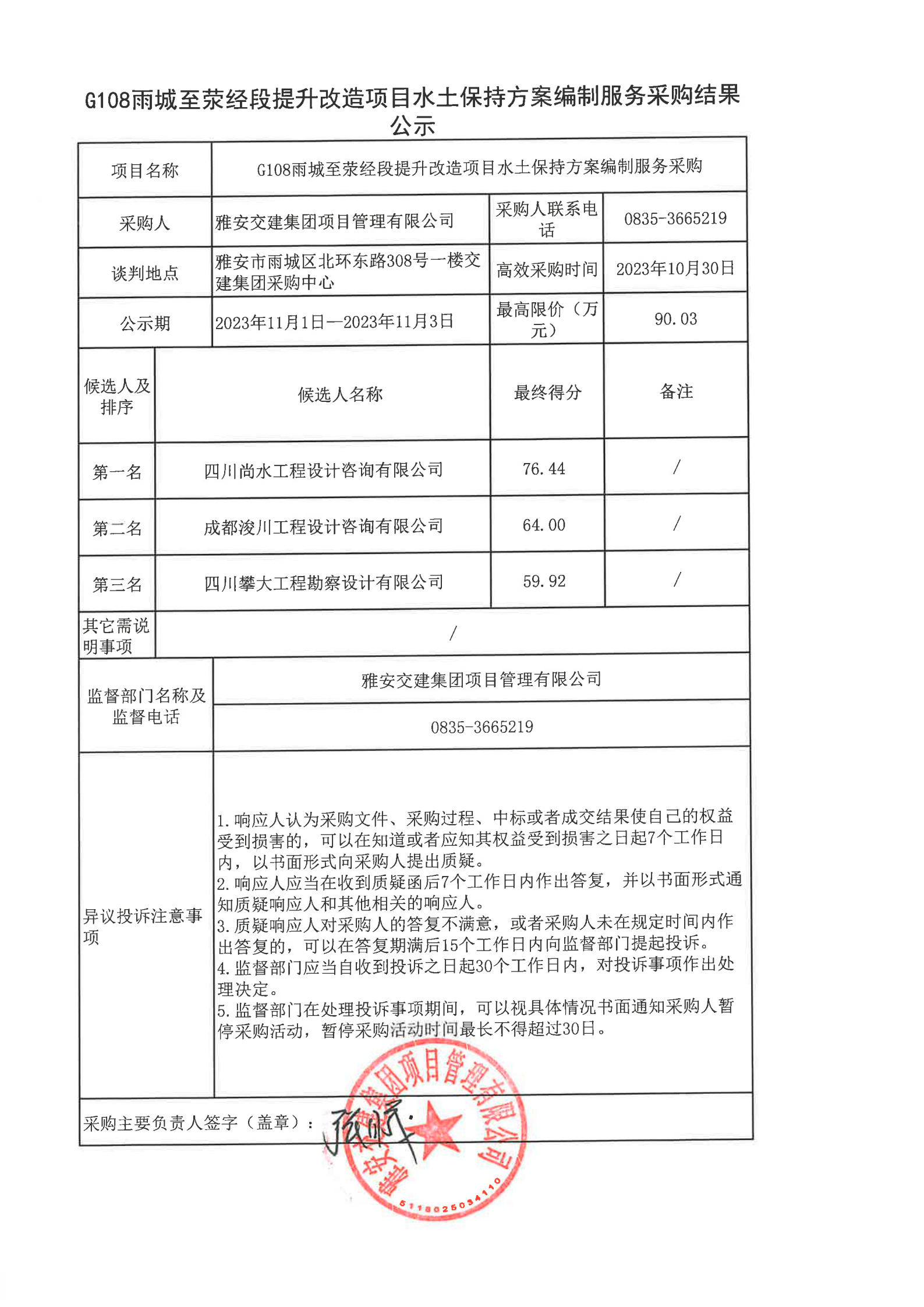 雅安交建集團項目管理有限公司G108雨城至滎經(jīng)段提升改造項目水土保持方案編制服務采購結(jié)果公示