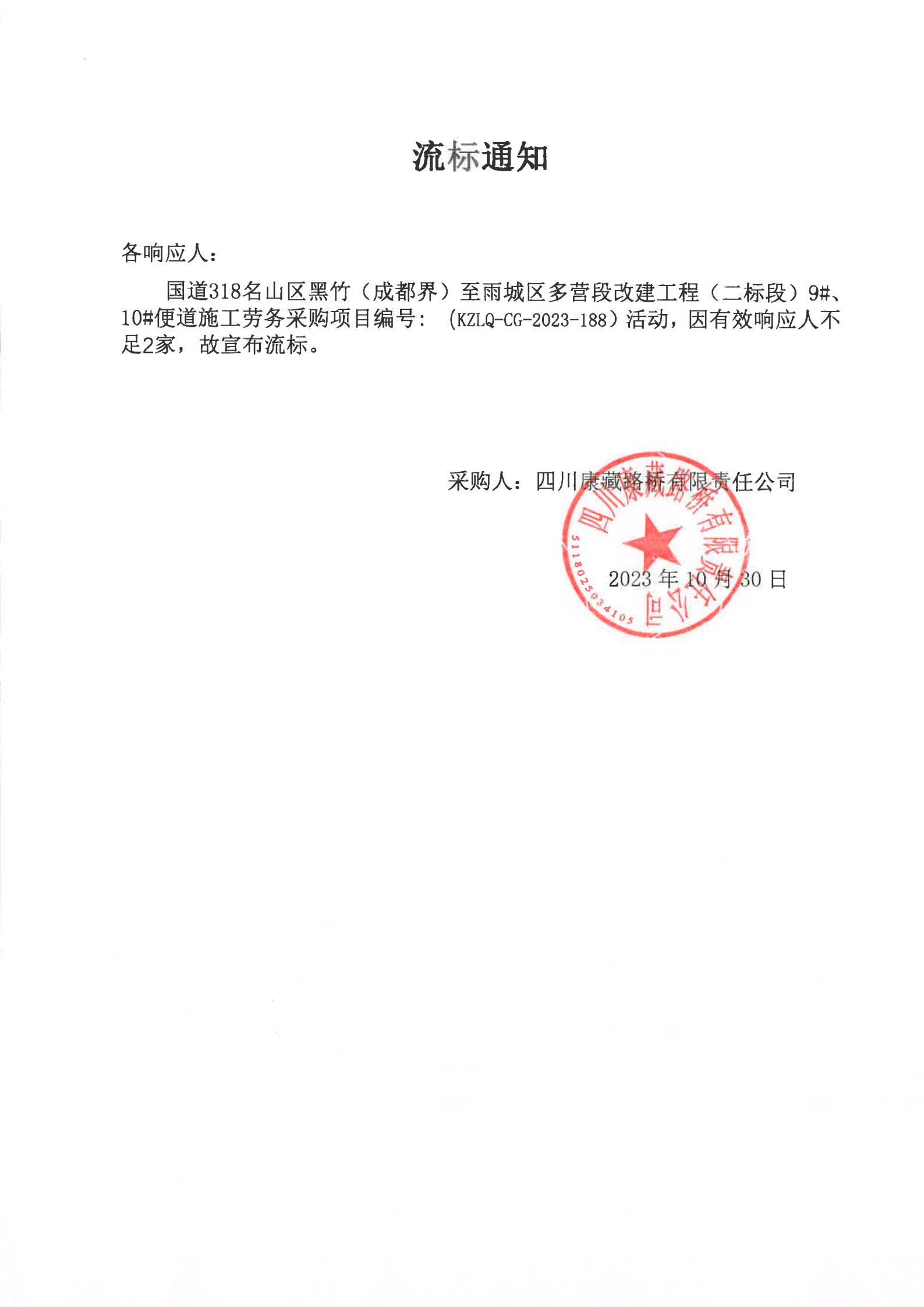 四川康藏路橋有限責任公司國道318名山區(qū)黑竹(成都界)至雨城區(qū)多營段改建工程(二標段)9#、10#便道施工勞務采購流標通知