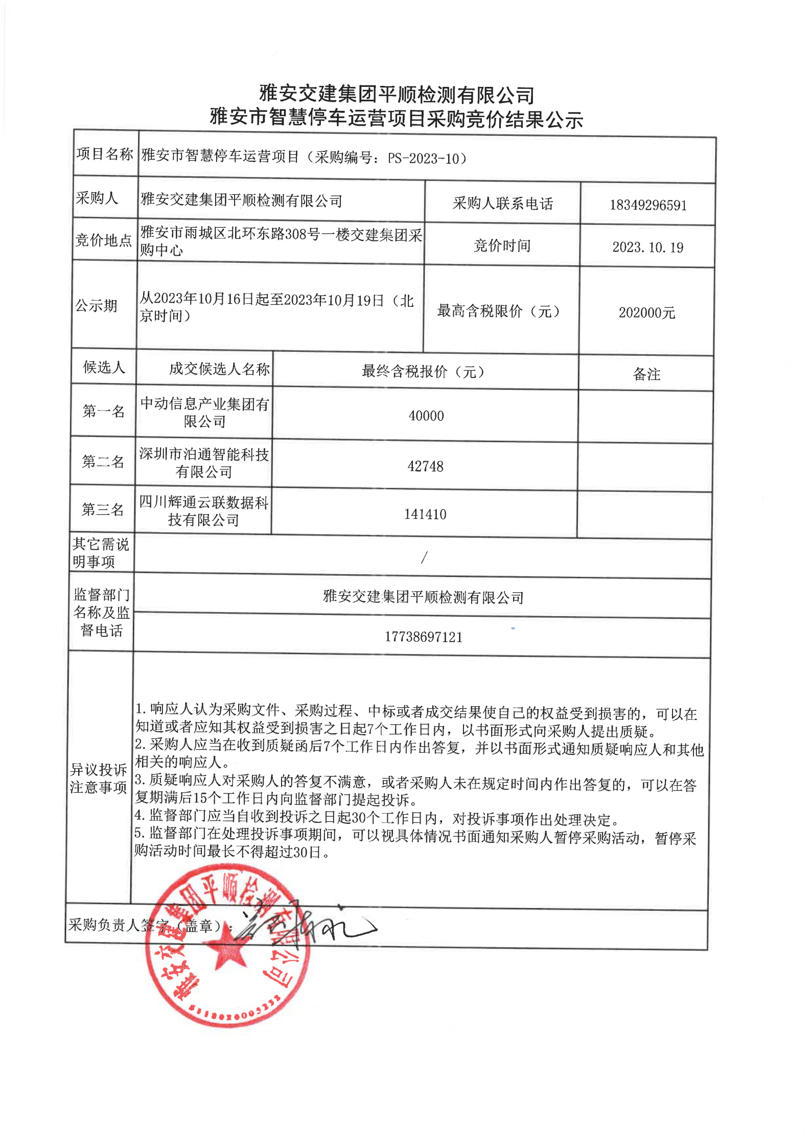 雅安交建集團(tuán)平順檢測有限公司雅安市智慧停車運(yùn)營項(xiàng)目采購競價結(jié)果公示