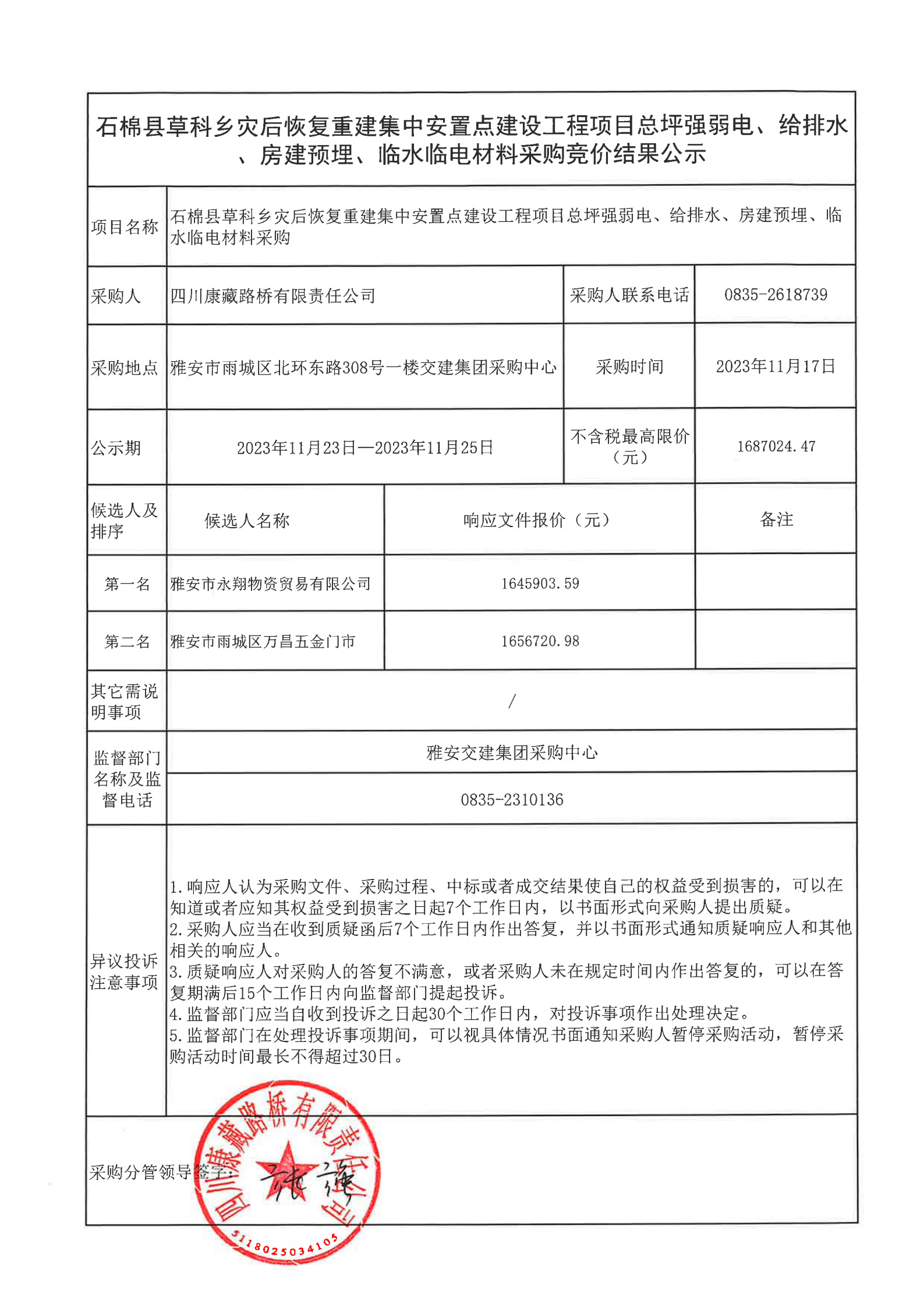四川康藏路橋有限責(zé)任公司石棉縣草科鄉(xiāng)災(zāi)后恢復(fù)重建集中安置點(diǎn)建設(shè)工程項(xiàng)目總坪強(qiáng)弱電、給排水、房建預(yù)埋、臨水臨電材料采購結(jié)果公示