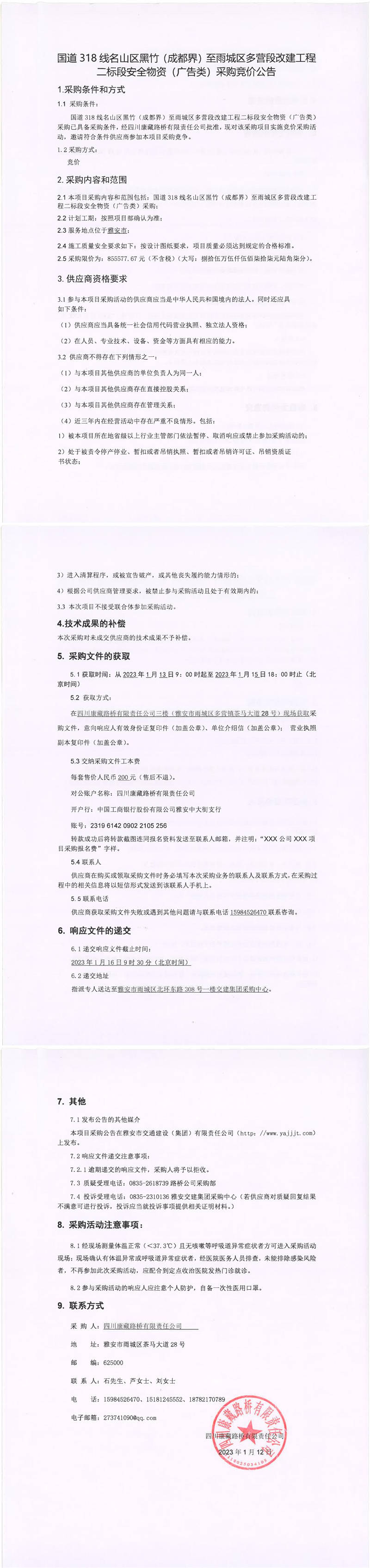四川康藏路橋有限責(zé)任公司國(guó)道318線名山區(qū)黑竹(成都界)至雨城區(qū)多營(yíng)段改建工程二標(biāo)段安全物資(廣告類)采購競(jìng)價(jià)公告