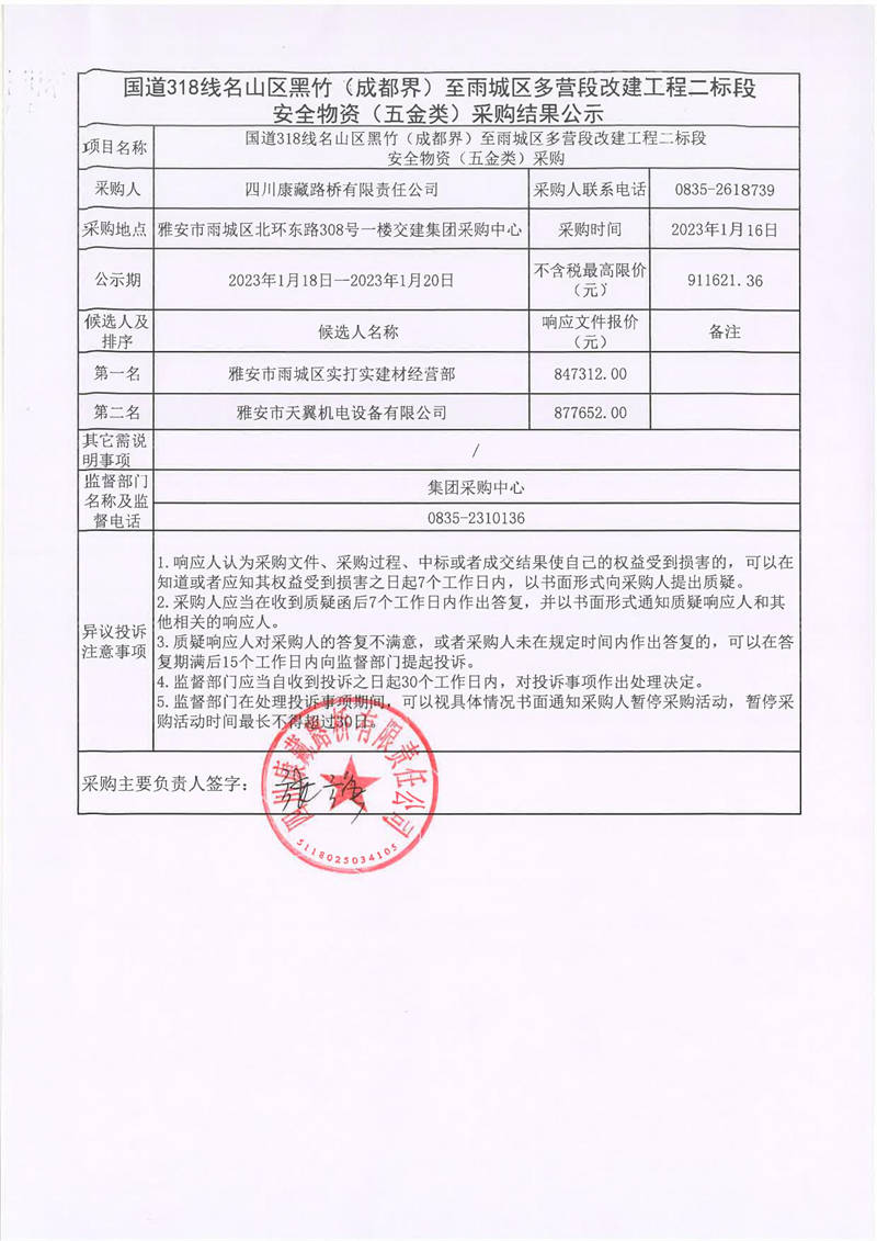 四川康藏路橋有限責(zé)任公司國道318線名山區(qū)黑竹(成都界)至雨城區(qū)多營段改建工程二標(biāo)段安全物資(五金類)采購結(jié)果公示
