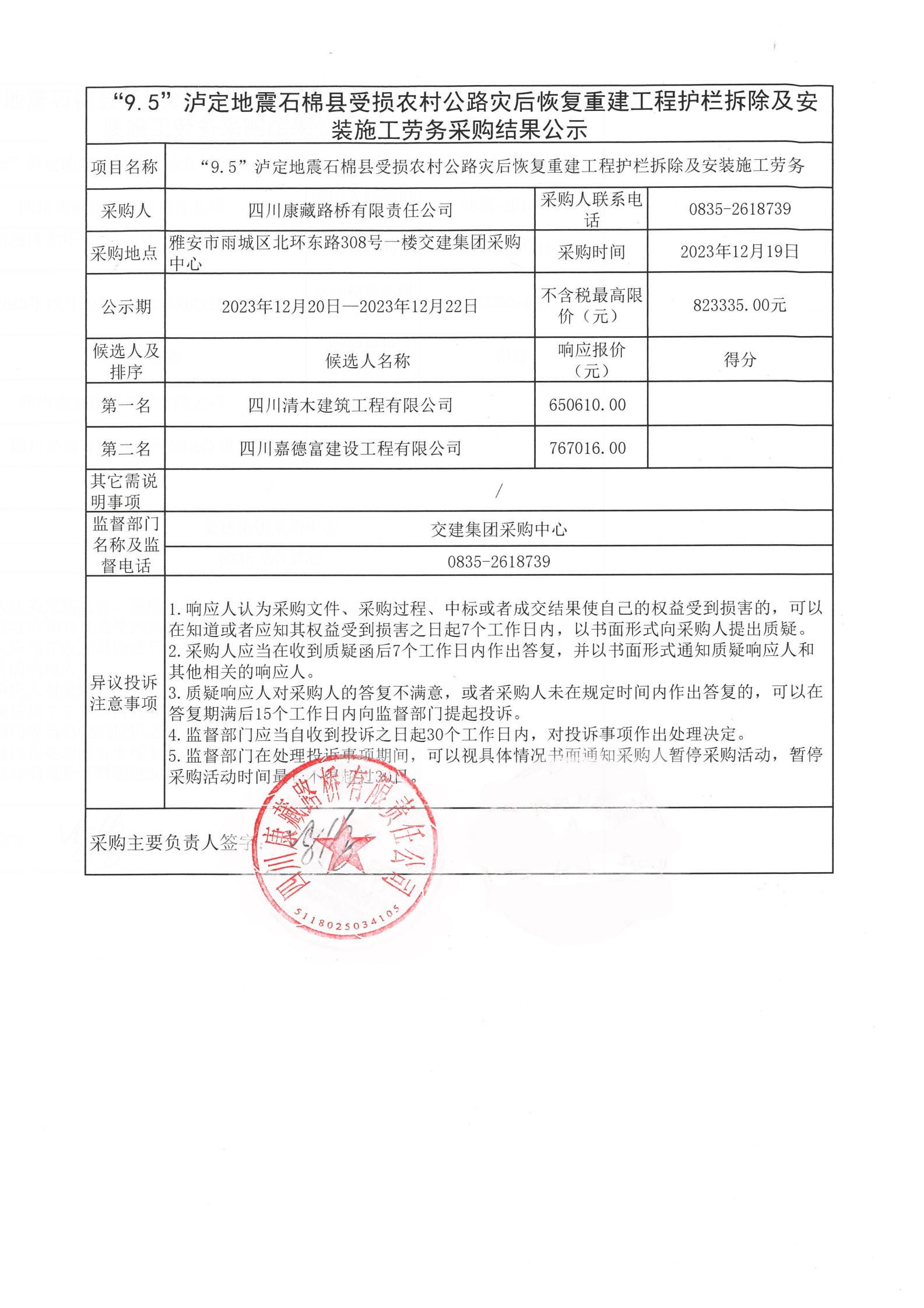 四川康藏路橋有限責任公司“9.5”瀘定地震石棉縣受損農(nóng)村公路災后恢復重建工程護欄拆除及安裝施工勞務采購結(jié)果公示