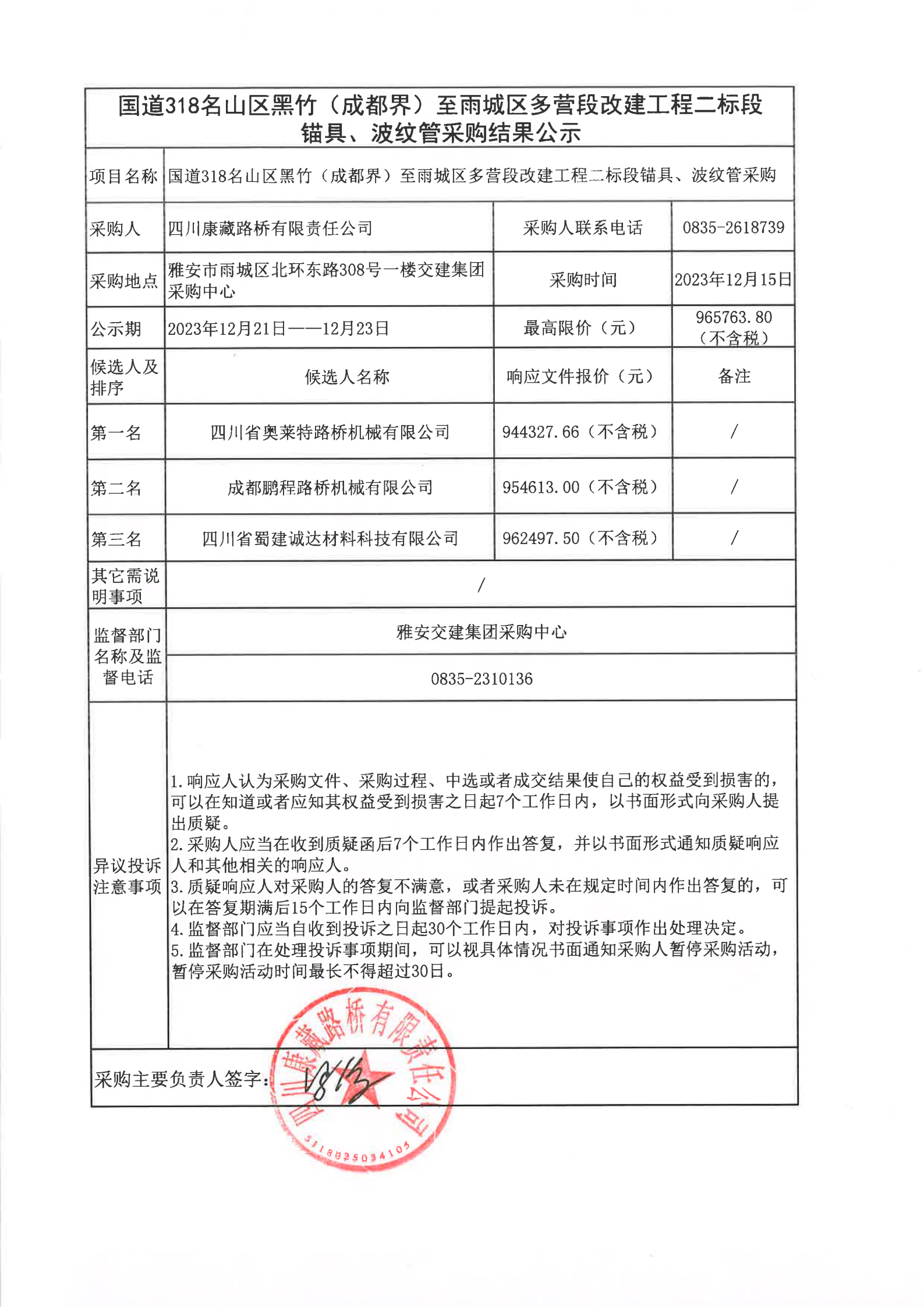 四川康藏路橋有限責任公司國道318名山區(qū)黑竹(成都界)至雨城區(qū)多營段改建工程二標段錨具、波紋管采購結果公示