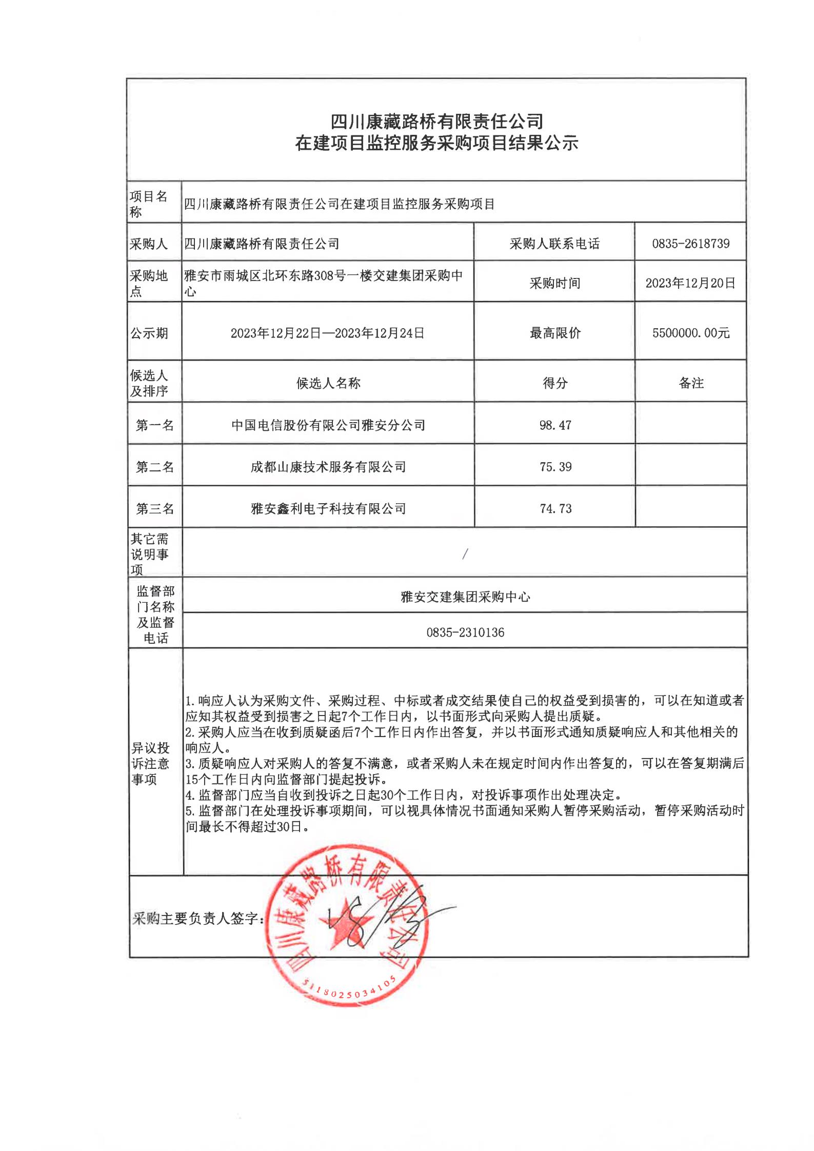 四川康藏路橋有限責任公司在建項目監(jiān)控服務(wù)采購項目結(jié)果公示