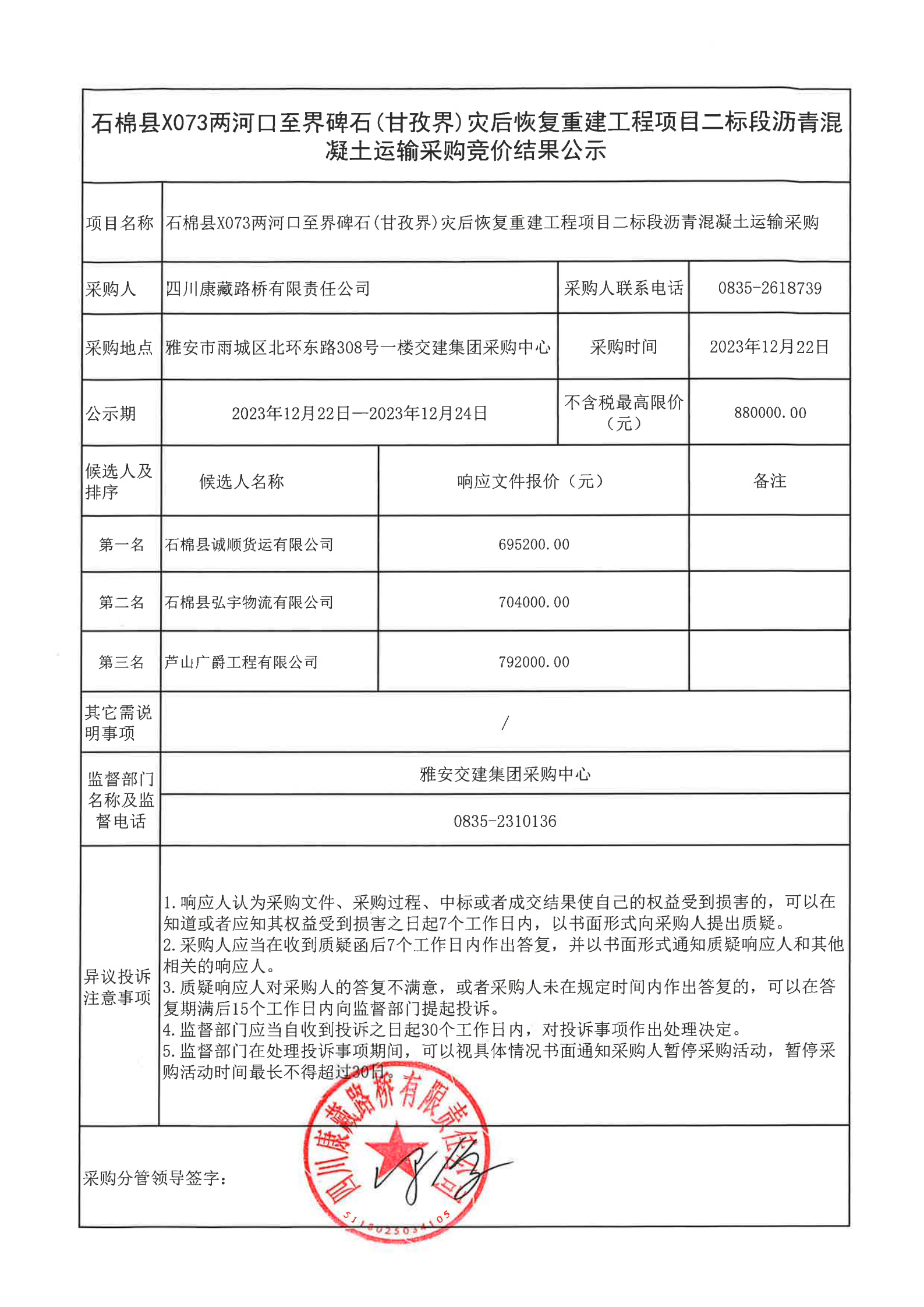 四川康藏路橋有限責任公司石棉縣 X073 兩河口至界碑石(甘孜界)災(zāi)后恢復重建工程項目二標段瀝青混凝土運輸采購競價結(jié)果公示