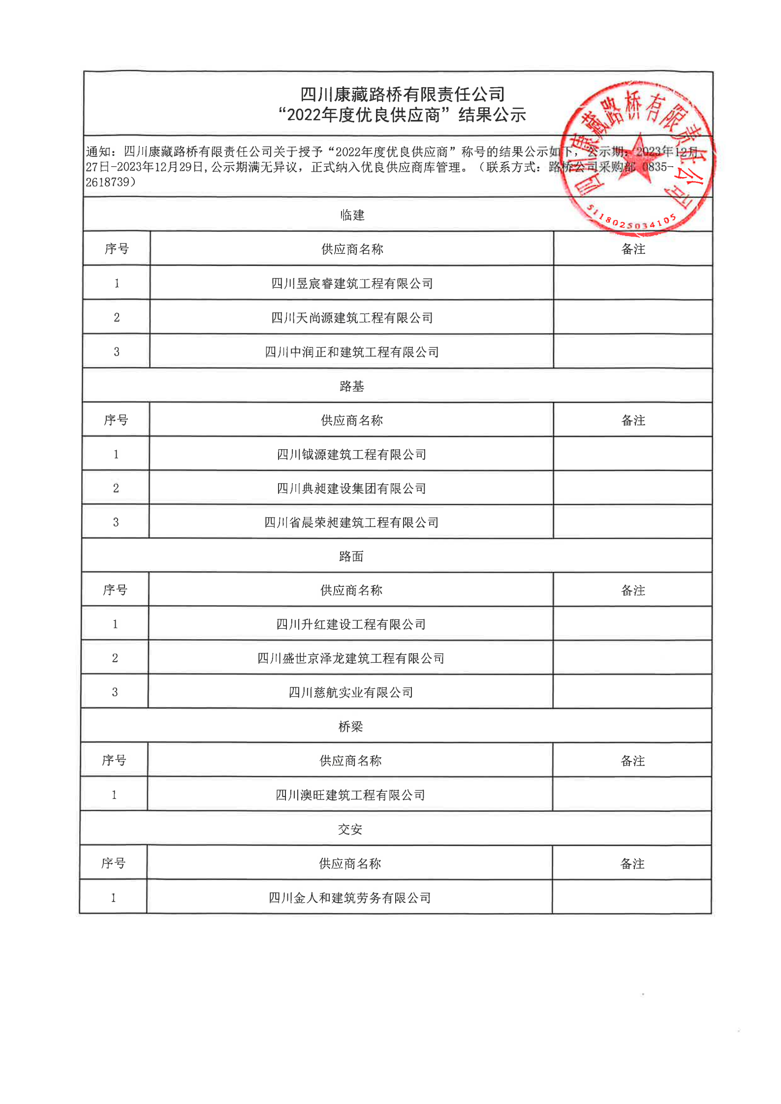 四川康藏路橋有限責任公司“2022年度優(yōu)良供應商”結果公示