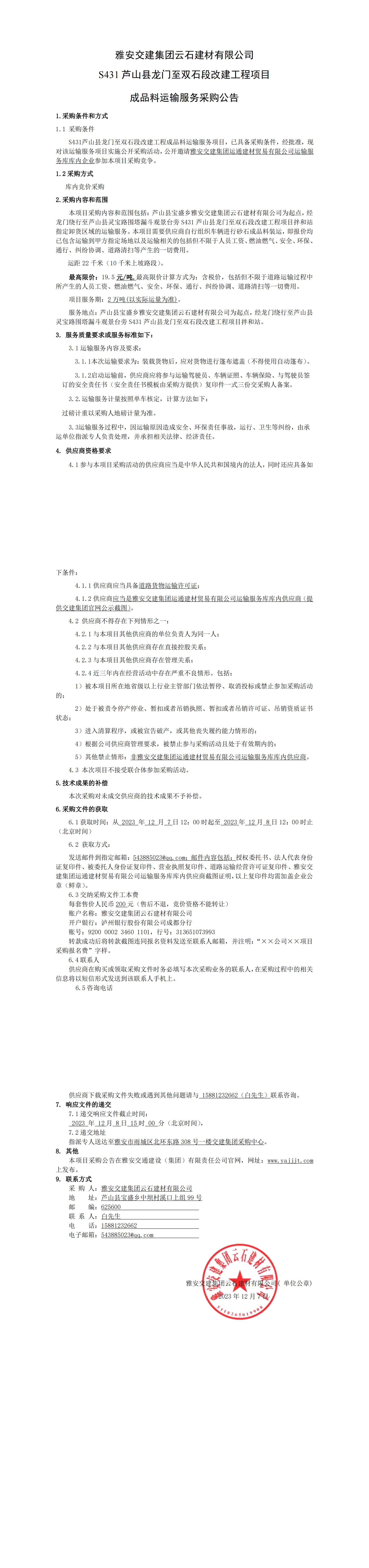 雅安交建集團(tuán)云石建材有限公司S431蘆山縣龍門至雙石段改建工程項目成品料運(yùn)輸服務(wù)采購公告
