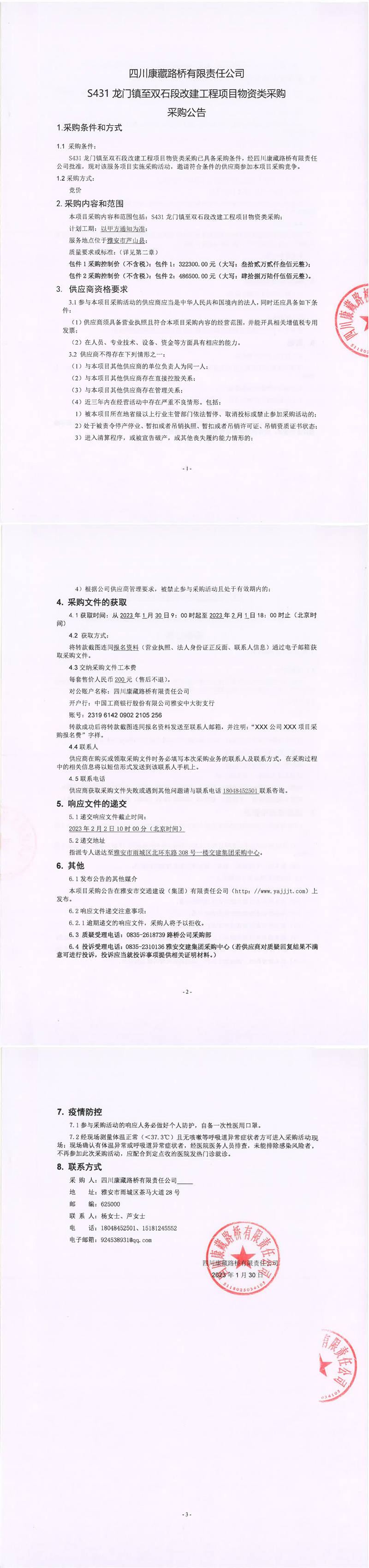四川康藏路橋有限責(zé)任公司S431龍門鎮(zhèn)至雙石段改建工程項(xiàng)目物資類采購(gòu)采購(gòu)公告