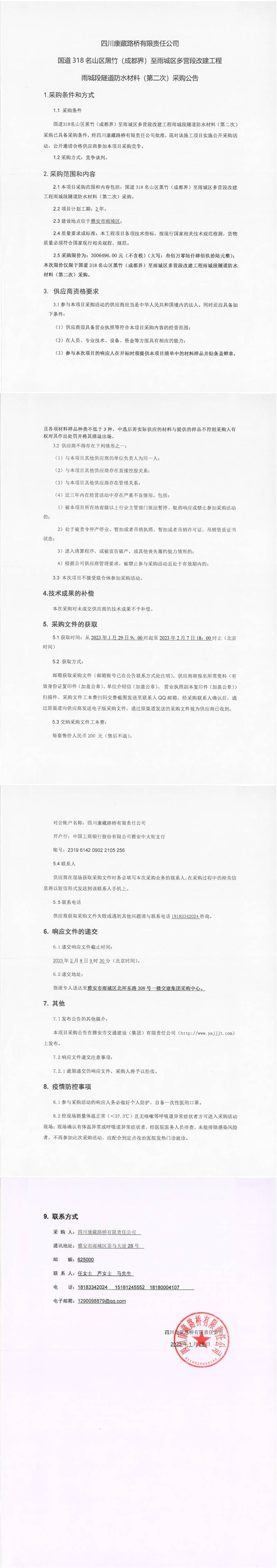 四川康藏路橋有限責(zé)任公司國(guó)道318名山區(qū)黑竹(成都界)至雨城區(qū)多營(yíng)段改建工程雨城段隧道防水材料(第二次)采購(gòu)公告