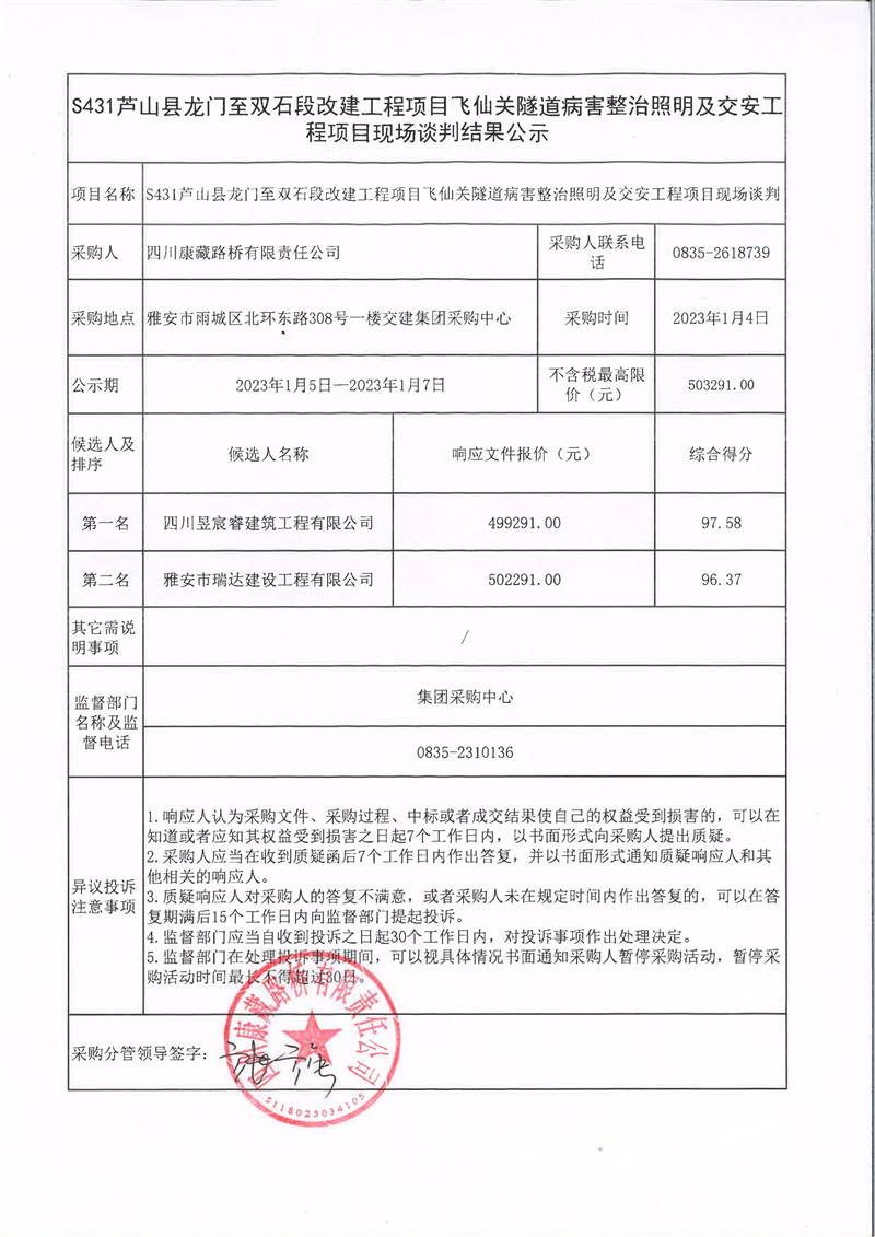 四川康藏路橋有限責(zé)任公司S431蘆山縣龍門至雙石段改建工程項目飛仙關(guān)隧道病害整治照明及交安工程項目現(xiàn)場談判結(jié)果公示
