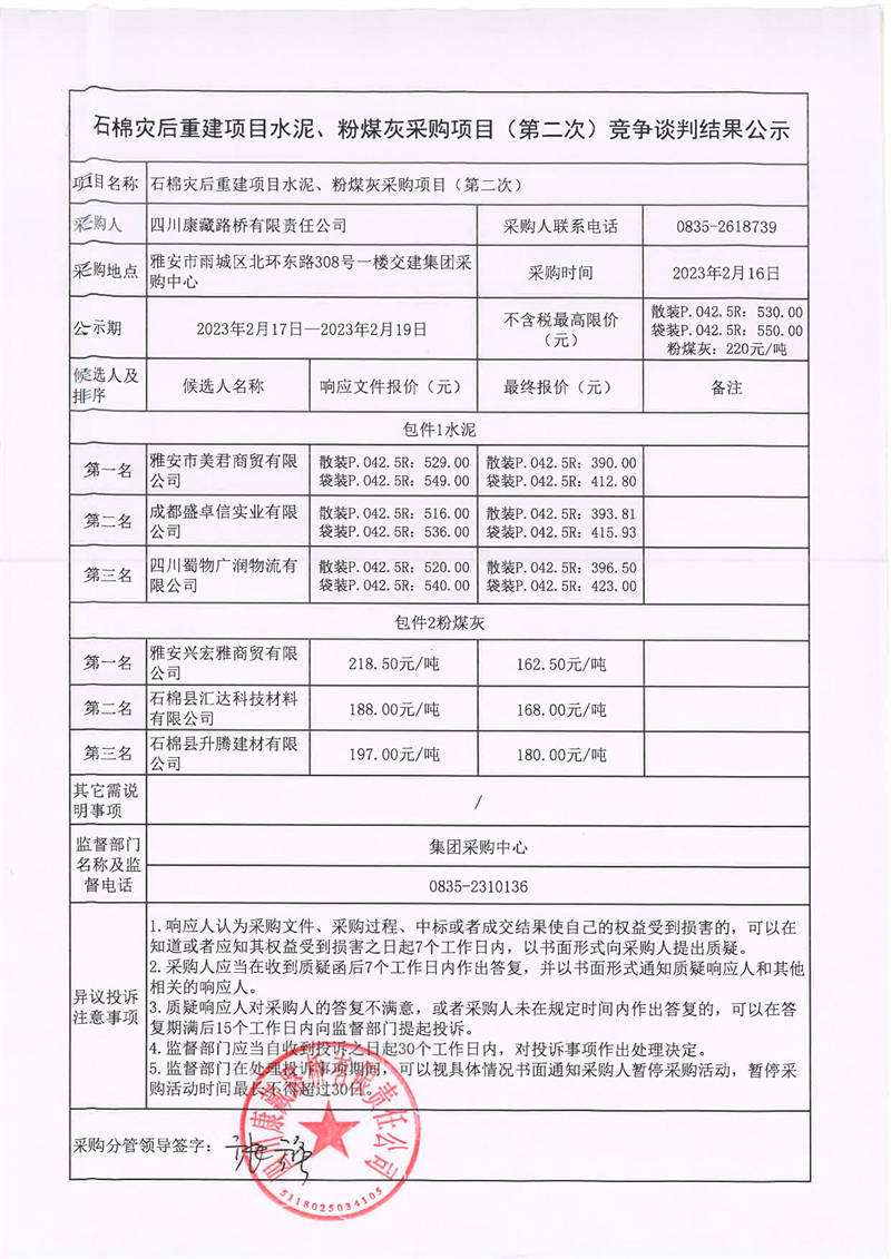 四川康藏路橋有限責任公司石棉災(zāi)后重建項目水泥、粉煤灰采購項目(第二次)競爭談判結(jié)果公示