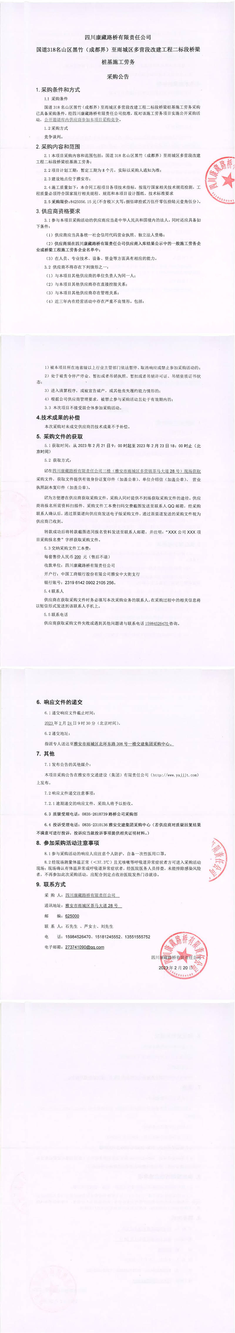 四川康藏路橋有限責(zé)任公司國道318名山區(qū)黑竹(成都界)至雨城區(qū)多營段改建工程二標段橋梁樁基施工勞務(wù)