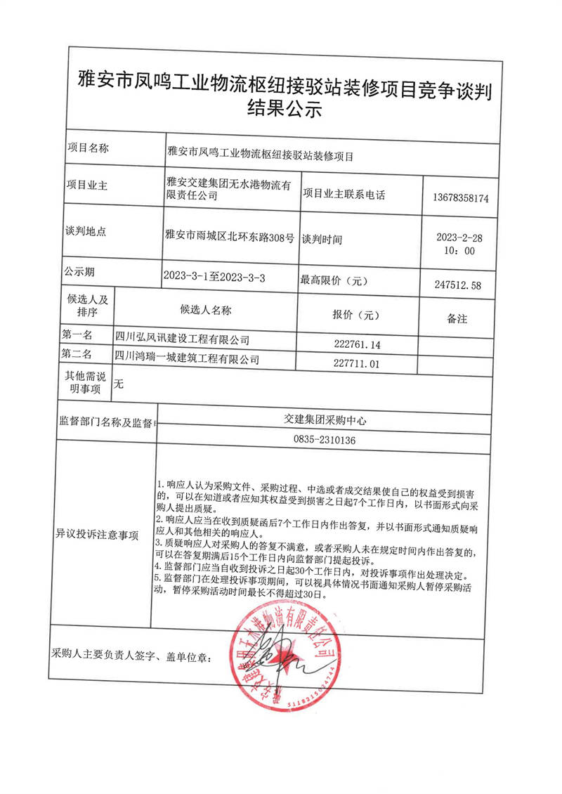 雅安交建集團(tuán)無水港物流有限責(zé)任公司雅安市鳳鳴工業(yè)物流樞紐接駁站裝修項(xiàng)目競(jìng)爭(zhēng)談判結(jié)果公示