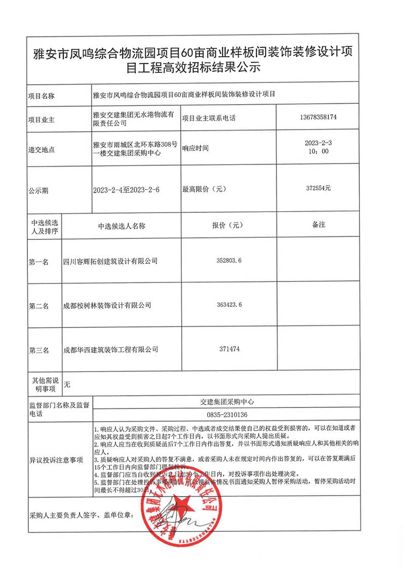 雅安交建集團(tuán)無水港物流有限責(zé)任公司雅安市鳳鳴綜合物流園項(xiàng)目60畝商業(yè)樣板間裝飾裝修設(shè)計(jì)項(xiàng)目工程高效采購結(jié)果公示