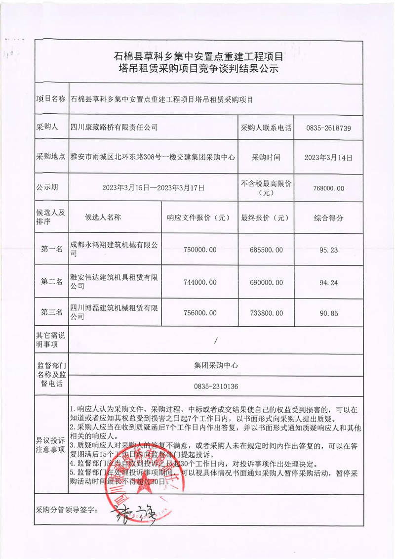 四川康藏路橋有限責(zé)任公司石棉草科鄉(xiāng)集中安置點(diǎn)重建工程項(xiàng)目塔吊租賃采購競爭談判結(jié)果公示