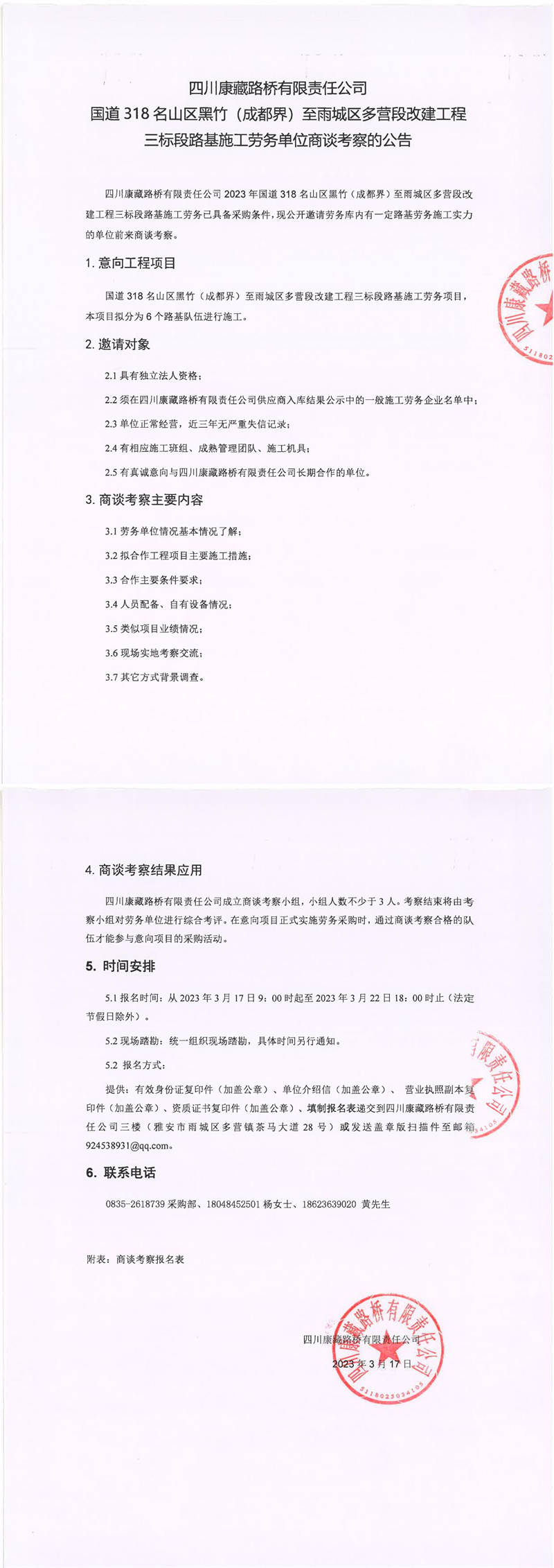 四川康藏路橋有限責(zé)任公司國(guó)道318名山區(qū)黑竹(成都界)至雨城區(qū)多營(yíng)段改建工程三標(biāo)段路基施工勞務(wù)單位商談考察的公告