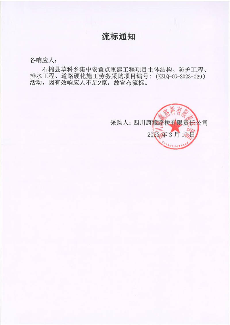 四川康藏路橋有限責(zé)任公司石棉草科鄉(xiāng)集中安置點重建工程項目主體結(jié)構(gòu)、防護工程、排水工程、道路硬化施工勞務(wù)采購流標(biāo)通知